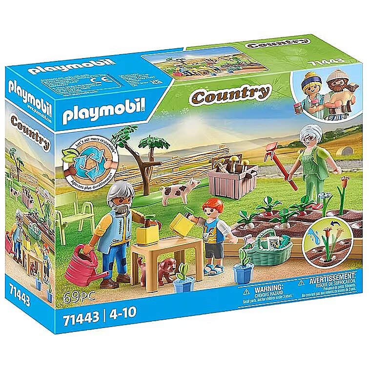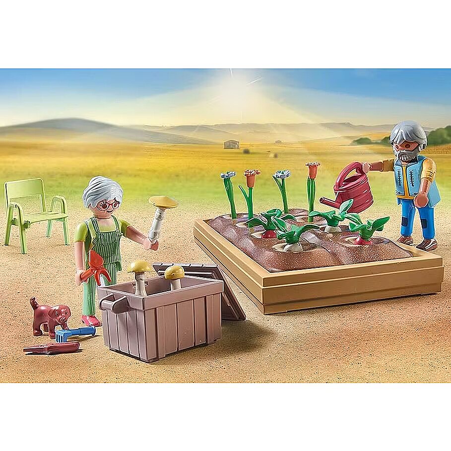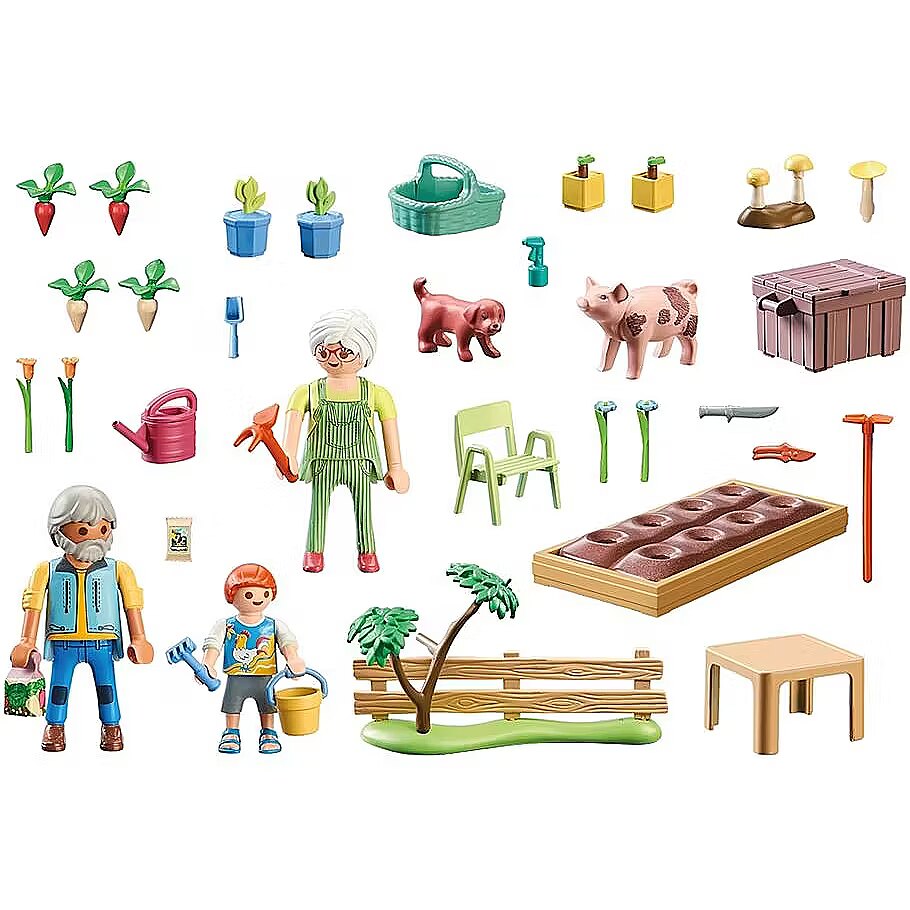 Description - What could be better than spending the vacations with your grandparents, taking care of the cute pet pig and learning a lot about gardening along the way? The bed can be filled with water to make the plants "grow". Introducing the PLAYMOBIL Country Vegetable Garden with Grandparents! Spark your child's imagination with this delightful toy set, designed for children aged 4 years and up. The set features grandparents and a grandchild, along with a piglet and a puppy. Made of over 80% sustainable material, it encourages eco-consciousness. Watch as the flowers "grow" when the bed is filled with water, plant new seedlings on the planting table, and cultivate mushrooms in the wooden box. Role-play has never been more rewarding!