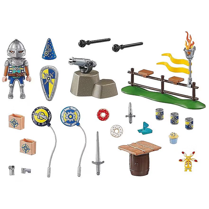 Technical_details - In PLAYMOBIL Novelmore, birthdays are celebrated in a slightly different way - namely with a cannon and a sword. This set celebrates the brave knight Arwynn. First he swaps his knight's helmet for a birthday hat - and then off he goes! The rotating and swiveling cannon is used to shoot gift bags and cans - and then there are delicious muffins! The set contains a total of 43 pieces. Item number: 100034242 Kind of construction toy EAN 4008789714473 Manufacturer no. 71447 Novelmore series Contents/equipment Figures: 1 knight (Arwynn). Accessories: 1 knight's helmet, 1 birthday hat, 1 shield, 1 sword, 1 dagger, 1 cannon on rock, 2 projectiles, 1 barrel with wooden board, 3 cans, 2 donuts, 1 muffin, 1 fence element, 1 torch holder with fire, 2 flag pennants, 2 bags with a target, 1 toy sailboat, 1 doll, 2 balloons, 2 fence holders for balloons Age recommendation from 4 years to 10 years Target group kindergarten children, school children Material: Plastic Warnings Warning: Not suitable for children under 36 months! Caution: Danger of suffocation due to small parts that can be swallowed!