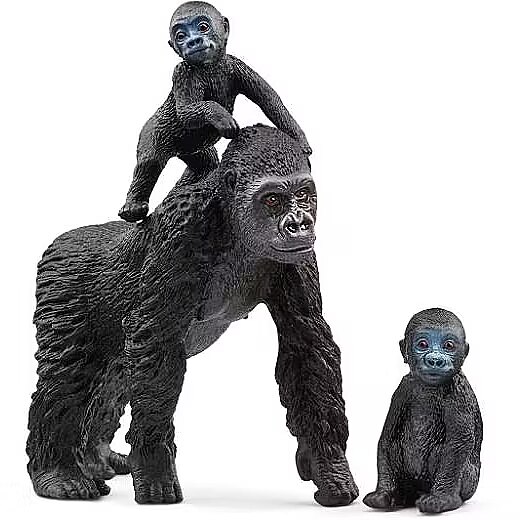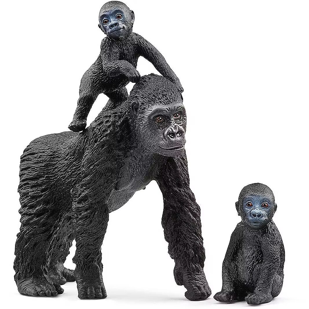 LongDesc - In the heart of the jungle, a mother gorilla watches her little ones discover the world around them. There's so much to explore! This set of three schleich® gorilla figurines captures the love between a mother and her children in beautiful detail. So realistic, even Mother Nature can't help but smile.Leaning forward on her arms, the gorilla mom stands by her little ones and watches carefully to make sure they are safe. One of the baby gorillas is probably still a bit tired. It sits on the ground gazing around sleepily. Maybe it's time for a little nap. Its sibling is much more active: trying to stand, crawling on all fours through the jungle and even climbing onto its mother's back. There are so many different games to play with this lifelike lowland gorilla family. Maybe the cute babies will grow up to be big gorillas in your playroom someday?
