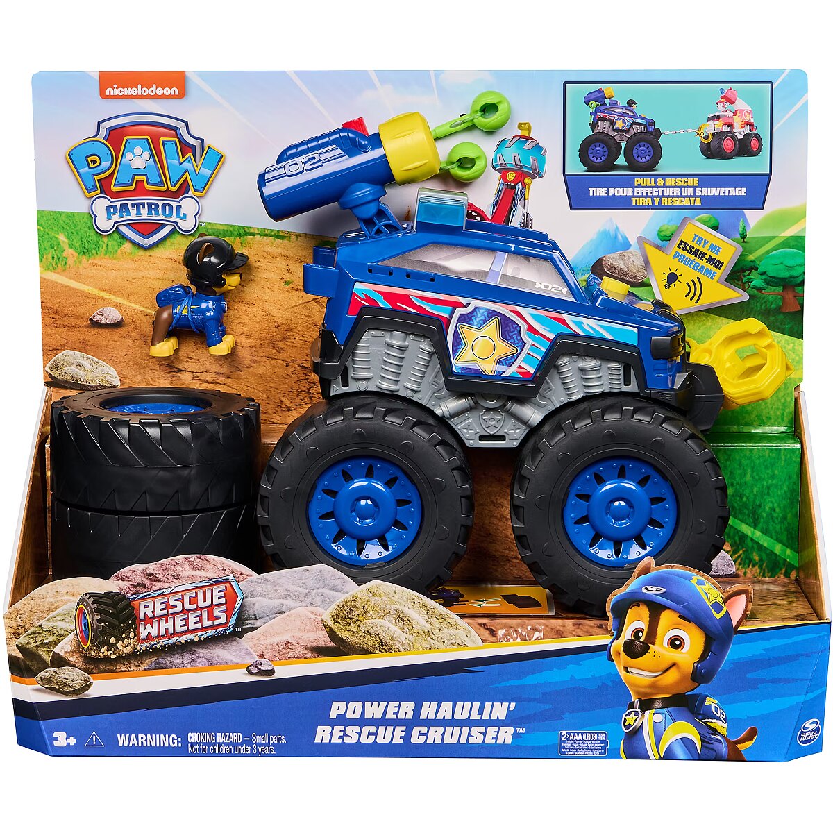 LongDesc - Embark on daring rescue missions alongside Chase, in his PAW Patrol: Rescue Wheels Power Haulin’ Rescue Cruiser! This dynamic monster truck toy boasts oversized wheels, captivating lights, and sounds straight from the show! Chase's vehicle is equipped with a motorized, retractable winch featuring a functional claw for thrilling play. The Cruiser showcases authentic PAW Patrol styling, mirroring the on-screen appearance. Secure your PAW Patrol Chase figure in the driver’s seat, load the projectile launcher with one of two projectiles, and press the launcher button to unleash action-packed fun! When friends are in a bind, manually extend the grappling hook, attach it with the claw, and activate the motorized winch for dramatic rescues, accompanied by engaging lights and sounds. PAW Patrol toys for boys & girls are great gifts for kids who are fans of the show, to foster imaginative pretend play and enhance fine motor skills. Relive cherished moments from PAW Patrol seasons, such as the Mighty Pups and the PAW Patrol Movie or create entirely new adventures with individual PAW Patrol pups and their respective toy cars (each sold separately). Elevate the excitement with the complete Rescue Wheels team, including PAW Patrol vehicles, action figures and the all-new PAW Patrol Tower HQ for endless hours of turbo-charged adventures inspired by the series!Includes: 1 Vehicle, 1 Chase Figure,2 Projectiles