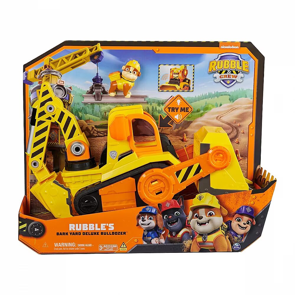 LongDesc - Team up with your favorite PAW Patrol Pup, Rubble, in his Bark Yard Deluxe Bulldozer! This PAWsome construction toy features real working wheels, two articulated toy tools and exciting lights and sounds, that make it a must-have for fans of the Rubble & Crew series! This awesome toy figure and vehicle set includes a Rubble play figure that measures over 2-inches tall and is dressed in his official Rubble & Crew uniform, so he looks just like he does in the show. When it’s time for action, clip Rubble onto the driver’s seat and push him down, to activate exciting lights and sound effects that you know from the show! Use the articulated excavator toy to begin digging, then move your dirt out of the way using the movable bulldozer scoop, just like Rubble does! For even more exciting ways to play, look for all the Rubble & Crew construction truck toys and toy figures and playsets with Kinetic Build-It sand, along with the Bark Yard Crane Tower Playset and Rubble’s Workshop Playset to build out your pretend play construction world even more (each sold separately)! Bring the excitement of the Rubble & Crew series to life with Rubble’s Bark Yard Deluxe Bulldozer!Includes: 1 Vehicle, 1 Rubble Figure