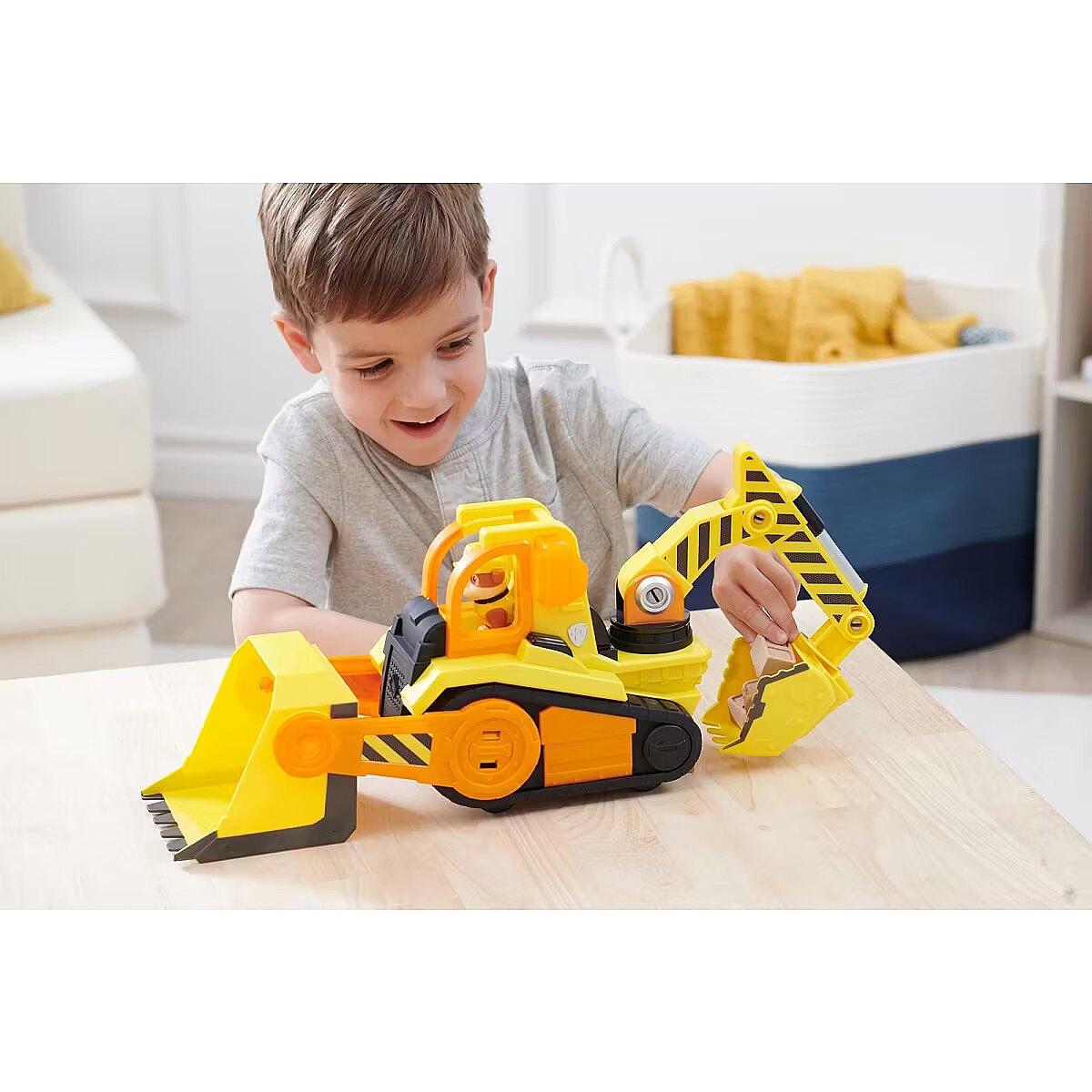 Description - Rubble i Jego Ekipa: Pojazd Rubble'a Deluxe Połącz siły ze swoim ulubionym szczeniakiem z Psiego Patrolu, Rubble'em, w jego buldożerze deluxe z Placu Szczekania. Ta psiastyczna zabawka budowlana ma prawdziwe działające koła, dwa przegubowe narzędzia oraz ekscytujące światła i dźwięki, które sprawiają, że jest to pozycja obowiązkowa dla fanów serii Rubble i jego Ekipa. Ten niesamowity zestaw z figurką i pojazdem zawiera figurkę Rubble'a o wysokości ponad 5 cm, ubraną w oficjalny strój Rubble'a i jego Ekipy, dzięki czemu wygląda dokładnie tak, jak w serialu. Gdy nadejdzie czas akcji, posadź Rubble'a a miejscu kierowcy i wciśnij go w fotel, aby włączyć znane z serialu ekscytujące efekty świetlne i dźwiękowe. Użyj przegubowej koparki, aby rozpocząć kopanie, a następnie usuń ziemię z drogi za pomocą ruchomej łyżki buldożera, tak jak robi to Rubble. Aby uzyskać jeszcze więcej ekscytujących możliwości zabawy, zainteresuj się wszystkimi zabawkami, figurkami i zestawami z piaskiem Kinetic Build-It z serii Rubble i jego Ekipa, a także na zestawem Wieży i Warsztatu, aby jeszcze bardziej rozwinąć swój świat udawanej zabawy w budowanie (każdy sprzedawany osobno). Buldożer deluxe z Placu Szczekania ożywi emocje związane z serią Rubble and Crew. FIGURKA KOLEKCJONERSKA: Rubble wygląda dokładnie tak, jak w serialu, w swoim oficjalnym mundurze budowlanym i realistycznymi detalami futra. Dzieci pokochają tworzenie przygód ze swoim ulubionym szczeniakiem z Psiego Patrolu. ZABAWKI BUDOWLANE DLA DZIECI: ciężarówka budowlana Rubble'a z buldożerem ma ruchomą łyżkę i działającą, obracaną koparkę, dzięki czemu dzieci mogą kopać, nabierać i ładować, tworząc przygody budowlane. ŚWIATŁA I DŹWIĘKI: Posadź Rubble'a na miejscu kierowcy jego ciężarówki, a następnie wciśnij go w fotel, aby włączyć migające światła i realistyczne efekty dźwiękowe z serialu, zapewniając ekscytującą zabawę. ZBIERZ JE WSZYSTKIE: Dla jeszcze lepszej zabawy zabierz do domu wszystkie zabawki do budowania z serii Rubble i jego Ekipa, pojazdy budowlane, figurki i pluszaki, aby tworzyć niekończące się przygody.