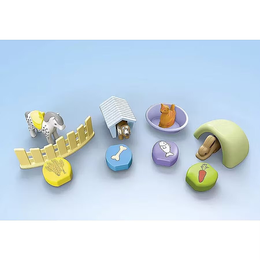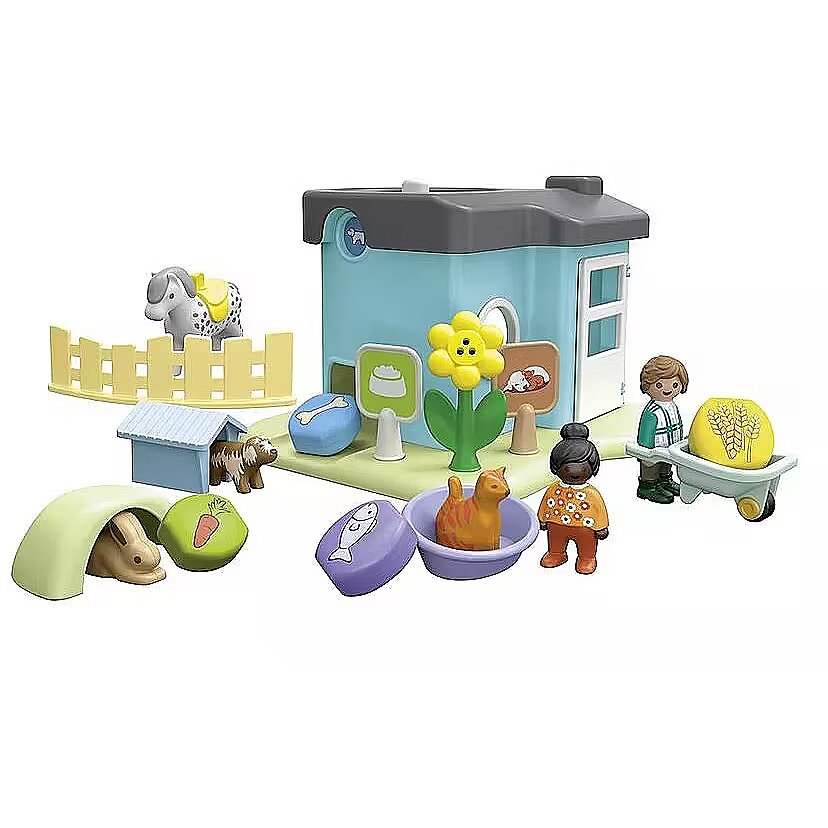 Accessories included - Figurki: 1 mężczyzna, 1 dziewczynka Zwierzęta: 1 kucyk, 1 pies, 1 kot, 1 zając Akcesoria: 1 hotel dla zwierząt, 1 buda, 1 koszyk, 1 schronienie dla zająca, 4 miski na pokarm, 1 taczka, 1 płot, 2 znaki, 1 kwiatek