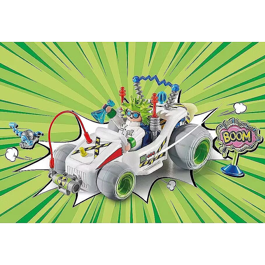 Get ready, get ready... The crazy professor takes off in his pull-back go-kart without hesitation. Bubbling test tubes, electrical equipment, and a jet engine transform his go-kart into a scientific sensation that puts everything else in the shade. High-speed races, driving around obstacles, or performing crazy stunts the PLAYMOBIL Funstars are ready to go!