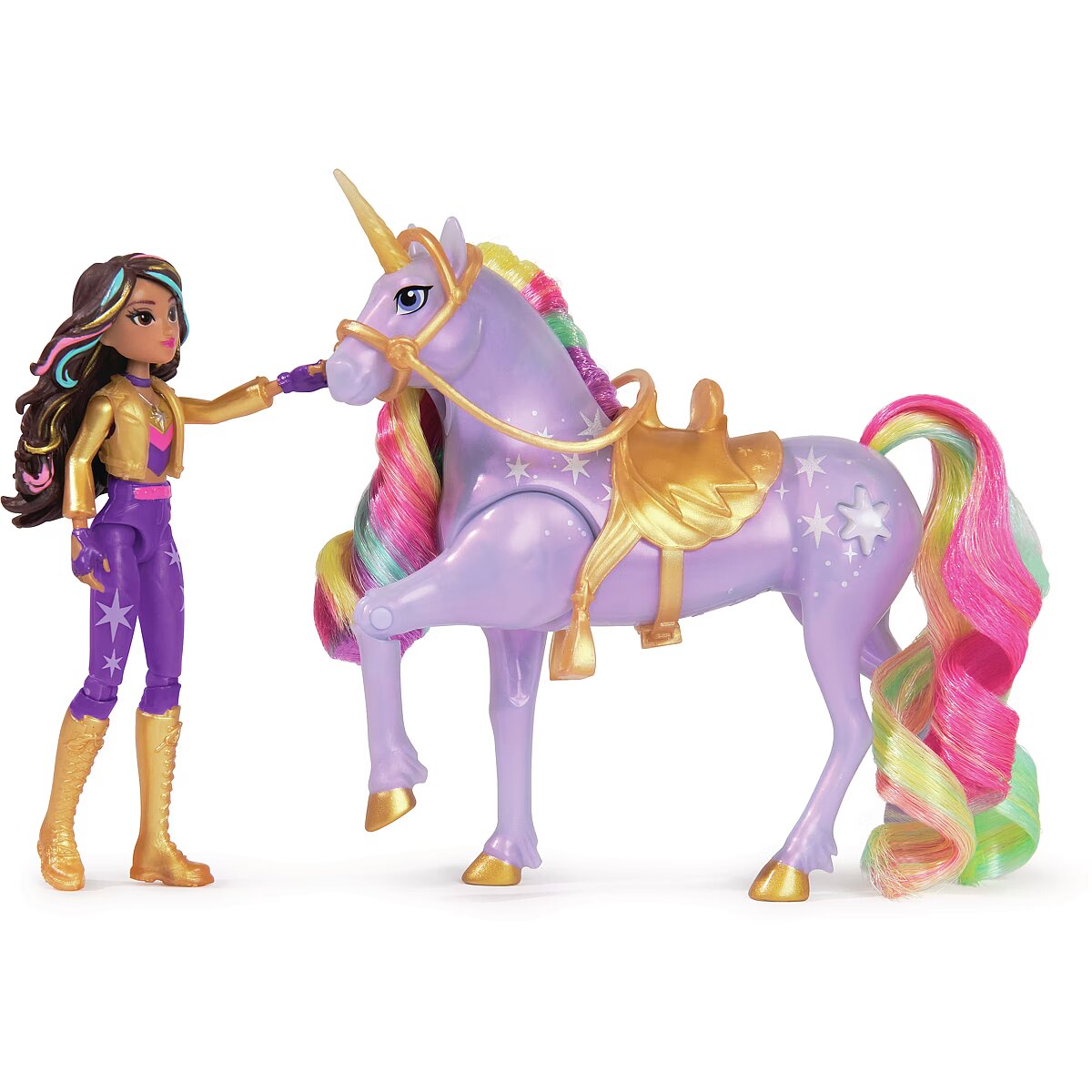 LongDesc - Experience the magic of Unicorn Academy with Sophia & Light Magic Wildstar! Inspired by the NETFLIX animated show and best-selling book series where friendship reins, this duo celebrates the unique bond between rider and unicorn. With their true-to-show details and soft rainbow mane and tail, and real light effects on Wildstar, this set will spark enchanting imaginative play. Featuring 7 points of articulation, pose Sophia to ride Wildstar and press the star marking button on the unicorn’s side to activate the lights (3 LR44 batteries included) as you recreate your favorite scenes. Wildstar stomps her hoof, using her Light Magic to project a rainbow pattern, just like in the show! Sophia securely stays in place on Wildstar with the removable bridle and saddle accessories. For more ways to experience Unicorn Academy with your favorite characters, look for the other small dolls, including Ava, Layla, Isabel, Valentina, and their unicorns (sets sold separately) and expand your world! For kids who enjoy unicorns and horse toys, dolls & accessories, doll house play, collectibles, plush toys and more, Unicorn Academy toys are fun birthday gifts for girls or gifts for any occasion. Shine bright in your Unicorn Academy adventures with Sophia & Light Magic Wildstar!Includes: 1 Doll, 1 Unicorn, 2 Removable Accessories (Bridle & Saddle), 1 Instruction Sheet