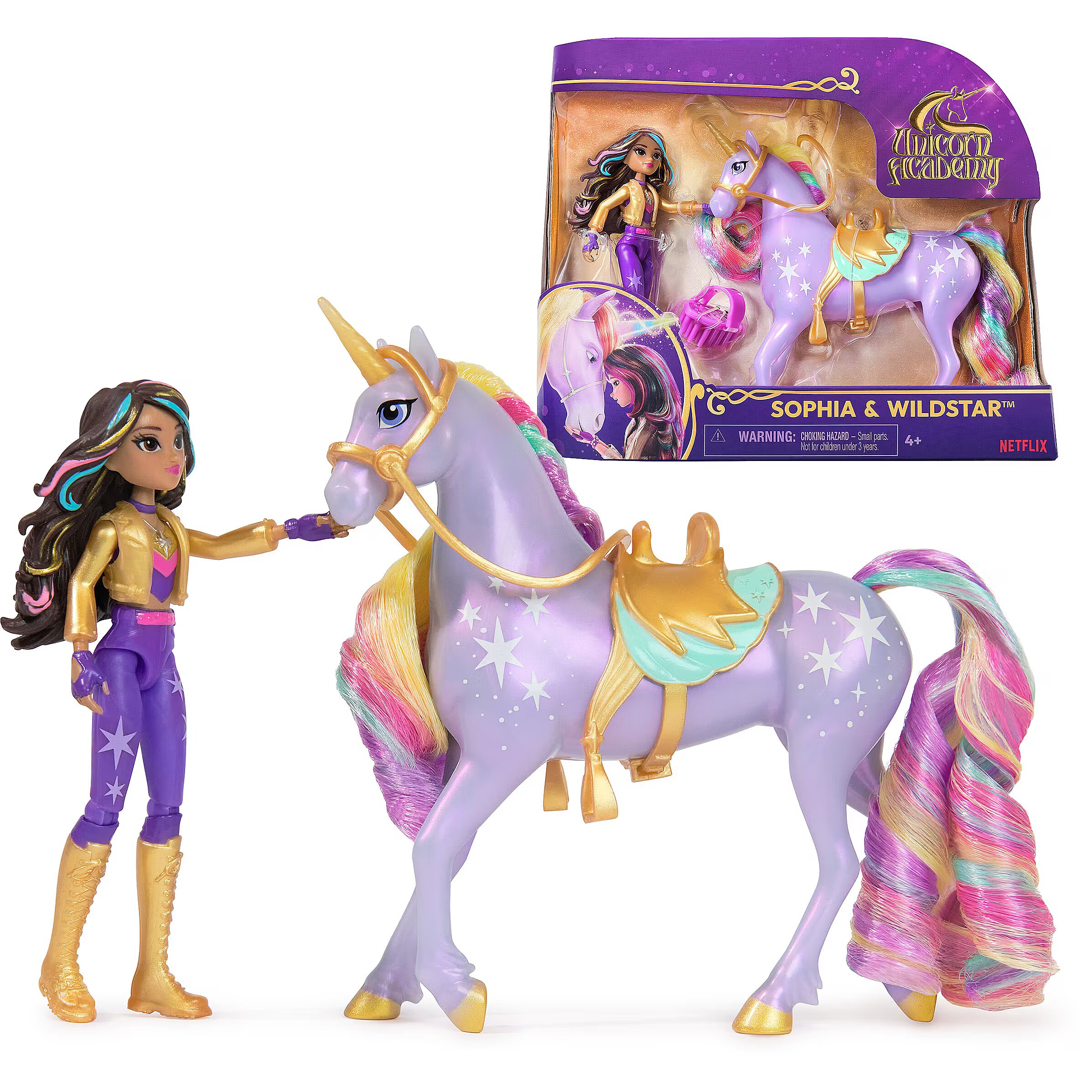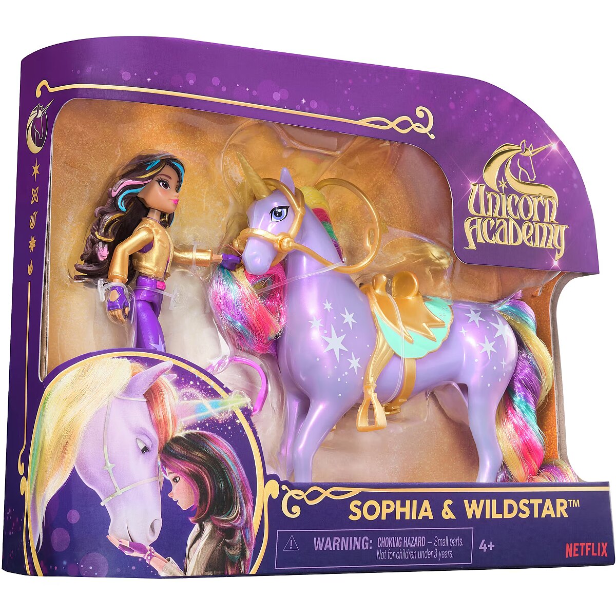 LongDesc - Celebrate the bond between rider and unicorn with the Unicorn Academy Sophia & Wildstar Set. Inspired by the NETFLIX animated show and best-selling book series where friendship reins, this set will spark endless imaginative storytelling. 4.5-inch Sophia features realistic true-to-show details and 7 points of articulation for dynamic poses. Wildstar stands at 5 inches tall, complimenting Sophia’s look with Light Magic markings and brushable rainbow mane and tail (brush included). As you play, pose Sophia to sit on Wildstar and ride into adventure. With the removable bridle and saddle accessories, Sophia can securely stay in place on Wildstar. For more ways to experience Unicorn Academy with your favorite characters, look for the other small dolls, including Ava, Layla, Isabel, Valentina, and their unicorns (sets sold separately) and expand your world. For kids who enjoy unicorns and horse toys, dolls & accessories, doll house play, collectibles, plush toys and more, Unicorn Academy toys are fun birthday gifts for girls or gifts for any occasion. Experience enchanting Unicorn Academy adventures with the Sophia & Wildstar Set.Includes: 1 Doll, 1 Unicorn, 1 Removable Saddle, 1 Removable Bridle, 1 Hair Styling Tool