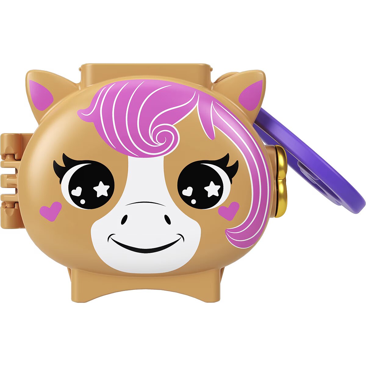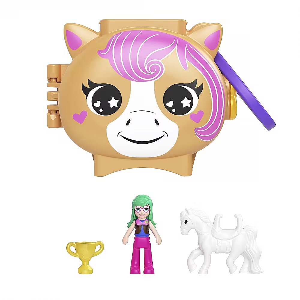 LongDesc - Polly Pocket Pet Connects compacts stack up playtime fun! Each portable toy features an adorable animal shape on the outside, like this cute horse, and opens to an animal-themed adventure on the inside. A micro doll, animal figure, storytelling accessory and kid-activated features fill the playset and engage imaginations. Kids can collect them all and stack the compacts on top of each other to build a bigger world. Heart-shaped clips attach to backpacks and more to take the compacts on the go. Offering anytime, anywhere fun, Polly compacts are ideal for kids 4 years and older. Each sold separately, subject to availability. Colours and decorations may vary.
