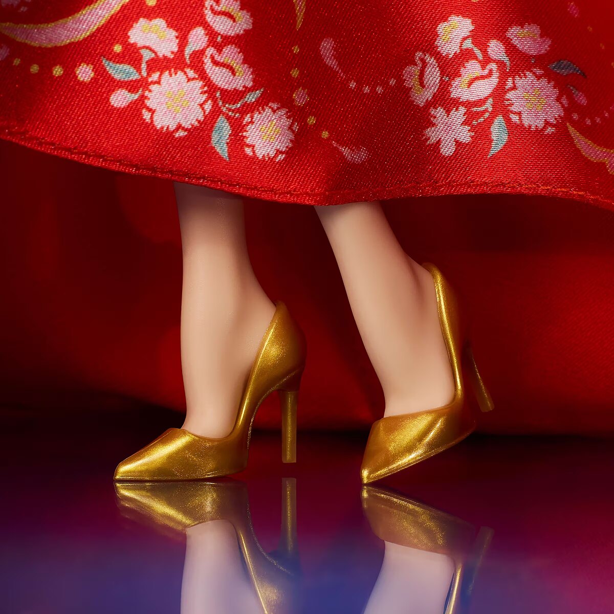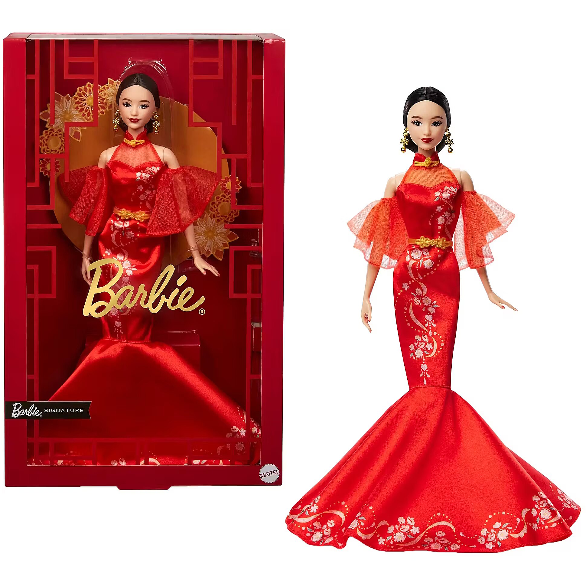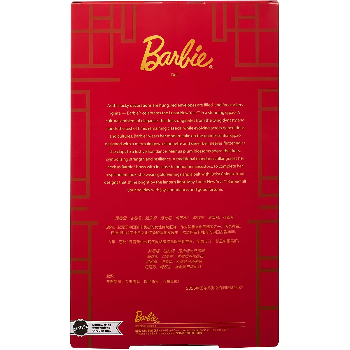 LongDesc - Ring in the Lunar New Year with Barbie doll! Resplendent in lucky red, she wears a quintessential qipao designed with a modern mermaid gown silhouette, a traditional mandarin collar, and sheer bell sleeves fluttering as she claps to a festive lion dance. Meihua plum blossoms adorn the dress, symbolizing strength and resilience. To complete her look, she wears golden earrings and a belt with lucky Chinese knot designs. May your Lunar New Year Barbie fill your holiday with joy, abundance, and good fortune. Doll cannot stand alone. Colours and decorations may vary.