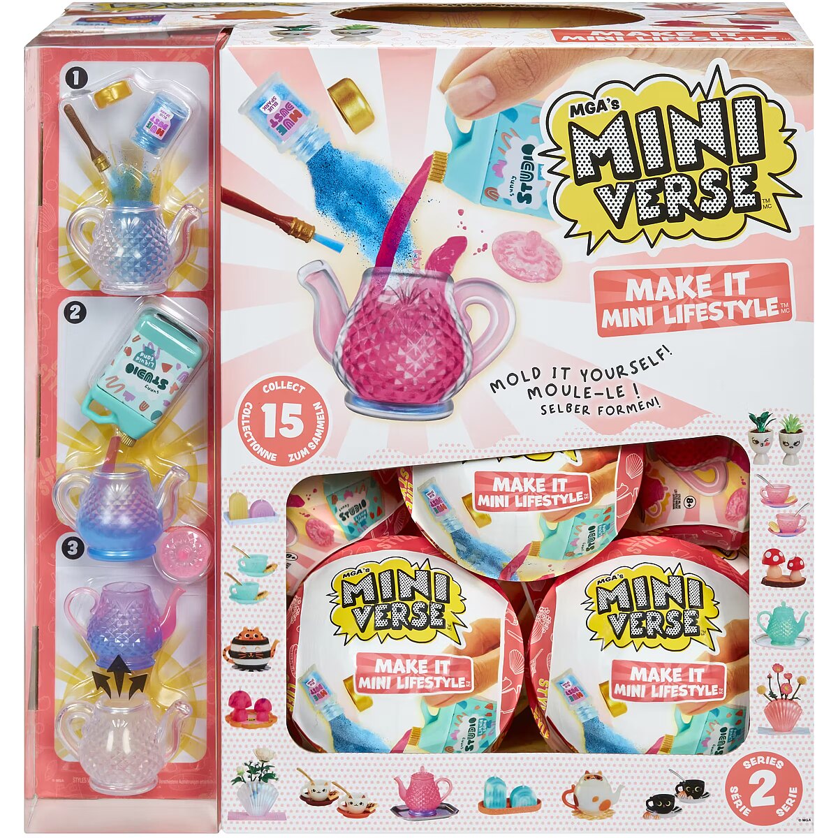 LongDesc - MGA's Miniverse™ is THE Lifestyle! Get ready for all-new DIY Make It Mini Lifestyle™ Series 2 items to mold, set, display, and collect! Each ball comes with realistic mini items to mold your own mini replicas of your favorite lifestyle and home decor pieces! From candles, to teacups, to teapots, each package is a SURPRISE so you won't know which mini you have until you unbox it! Compare the contents of your package with the included collector's guide to see which mini you have. Use the provided items and molds and follow the instructions on the back to make your mini. Once you've finished molding your mini, set your replica in any UV light (like the sun) until the resin has hardened. Once it's set, you've got a collectible ready for display!DISPLAY IT! Our MGA's Miniverse™ lifestyle capsules double as display cases for your minis. Simply place your mini on the capsule's shelf and admire your collection!Collect all the Make It Mini Lifestyle™ Series 2 minis! Visit the MGA's Miniverse™ Store to shop and learn more about all the MAKE IT MINI™ creations you can collect!DISCLAIMER: ALL Ingredients are NOT edible and do include resin play. Not suitable for kids under 8 years of age.