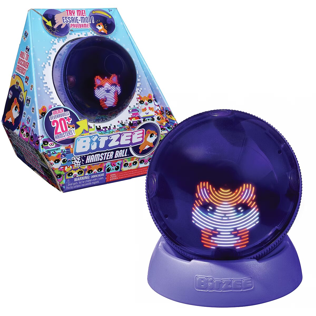 LongDesc - Introducing Bitzee Hamster Ball: digital friends you can interact with. Hamster Ball digital pets respond to touch and movements with cute sounds and reactions. Each Hamster Ball starts with a baby hero hamster. Feed your Bitzee, pet them, exercise on the hamster wheel and more. Watch your hero grow from baby to teen to Super Bitzee. Explore and roll to discover treats, items and 20 friends to collect with unique themes. Will you collect the Super Bitzee friends? Hamster friends even evolve at the same time as your hero and interact on the screen with them. Customize your hero Bitzee hamster’s outfits, backdrop and pose; snap a picture and scroll through looks. Plus, play 5 mini games. Includes 3 AA batteries. Warning: produces flashes that may trigger epilepsy in sensitised individuals. Kids who enjoy animation, kids’ electronics, surprise toys, animal toys, fidget toys and STEM toys will love Bitzee toys for boys and girls. Even adults will be mesmerized with Bitzee’s screen-free innovative twist on 90s toys & games from their childhood. Bitzee interactive pet toys for kids are must-have birthday gifts or gifts for girls and boys for any occasion. Roll into adventure with Bitzee Hamster Ball.Includes: 1 Bitzee Hamster Ball, 1 Stand, 1 Quick Start Guide, 1 Instruction Sheet