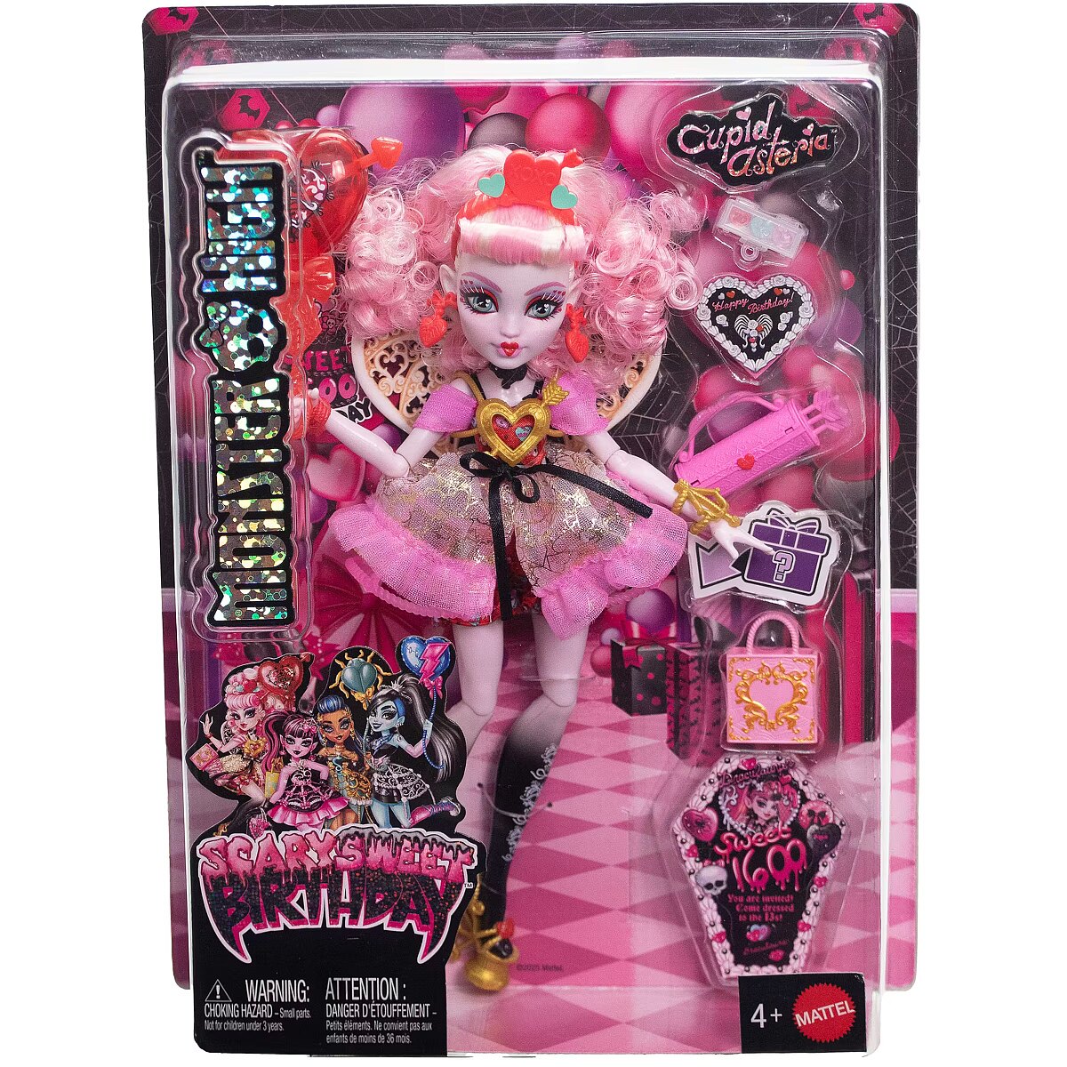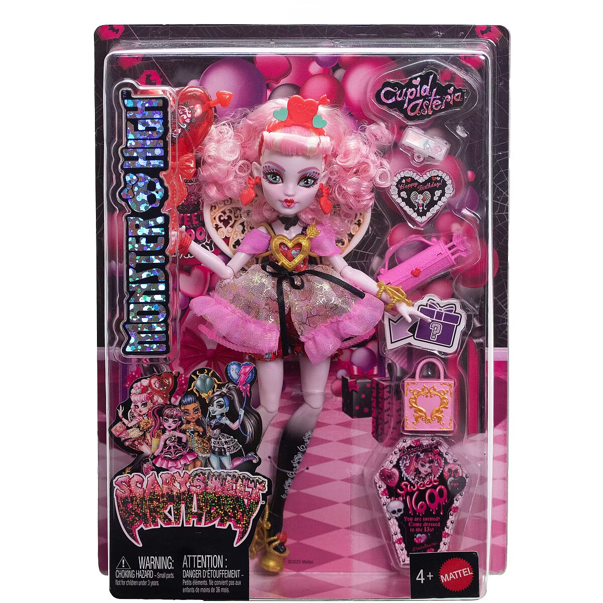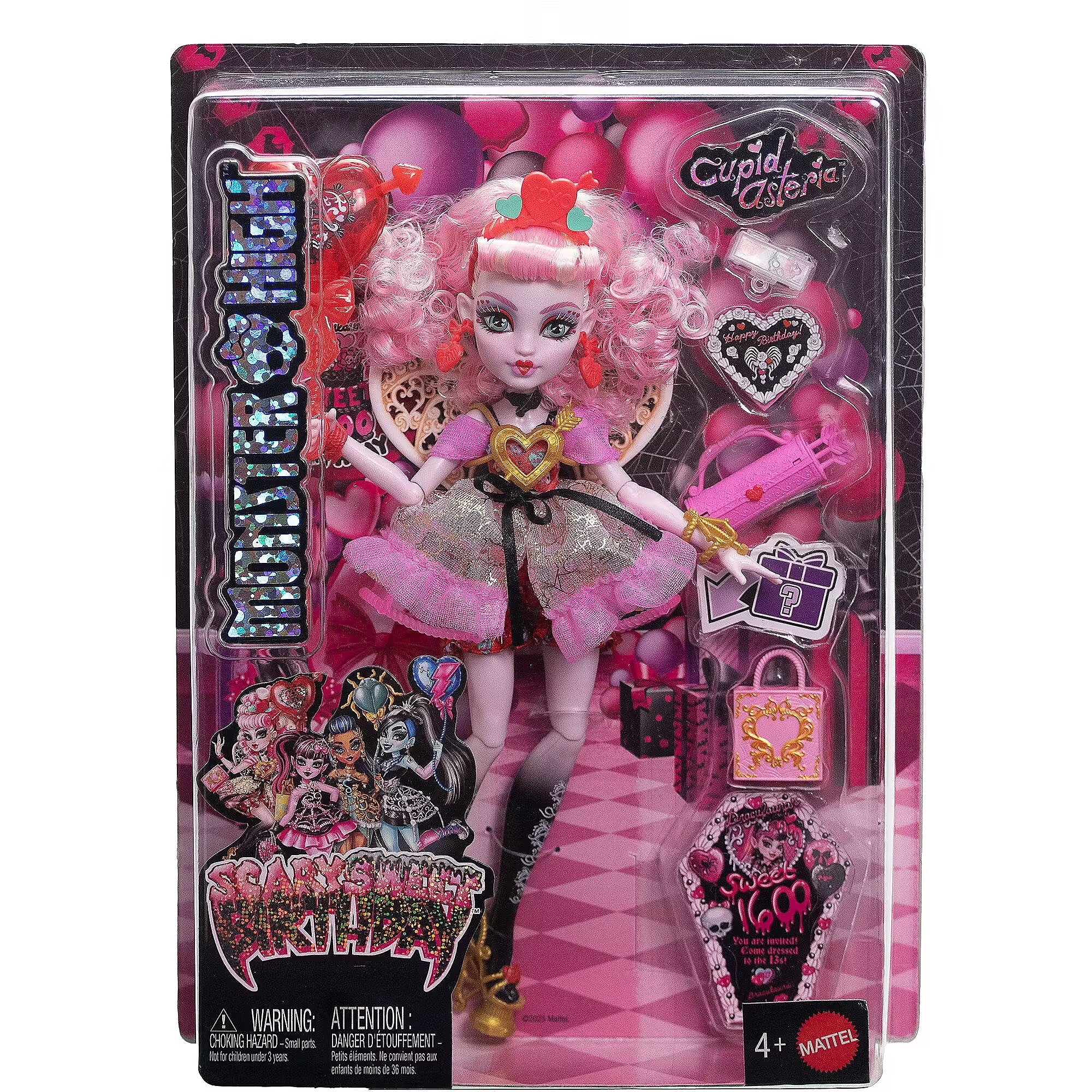 LongSummaryDescription - Monster High Scary Sweet Birthday Cupid Asteria Doll in Party Dress with Balloon & Gift. Doll type: Fashion doll, Doll's gender: Female, Recommended age (min): 4 yr(s), Suggested gender: Boy/Girl. Height: 290 mm, Weight: 250 g. Material: Fabric, Plastic, Product colour: Multicolour