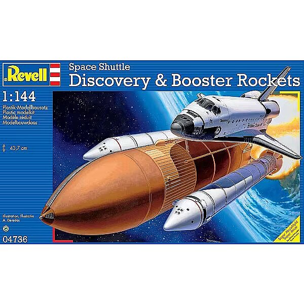 Description - Space Shuttle Discovery & Booster Rockets - an American space shuttle designed to make multiple trips to orbit. It is the third NASA shuttle to make a flight into space (Columbia and Challenger had previously made such a journey). Its purpose is to transport crew and exchange supplies to the International Space Station. Recommended paint colours: 32105, 32109, 32117, 32179, 32301, 32302, 32371, 32382. Revell plastic model kit ( REV-04736 ) does not include paint and glue.