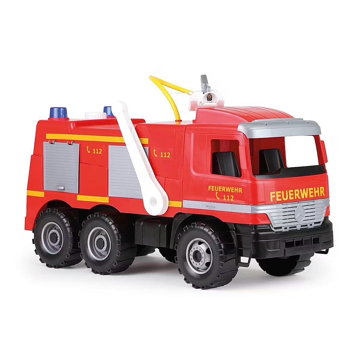 Description - Lena Giga Trucks Straż pożarna Actros z naklejkami, 3-osiowe osie ze stali ocynkowanej 6 mm. Strzykawkę na dachu można obracać w dowolnym kierunku. Dźwignia z boku pojazdu napędza stabilną pompę tłokową wewnątrz pojazdu w celu uzyskania maksymalnej wydajności. Armatka strzela do 8 metrów z 1,5-litrowego zbiornika. W zestawie 12 naklejek straży pożarnej do przyklejenia. Długość: 63 cm. Odpowiedni dla dzieci od 3 lat. Nadaje się do użytku wewnętrznego i zewnętrznego.