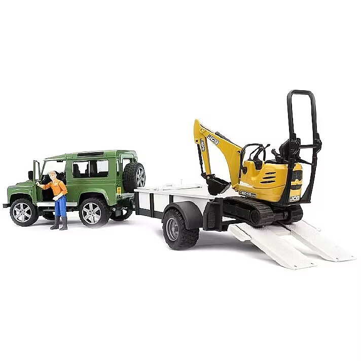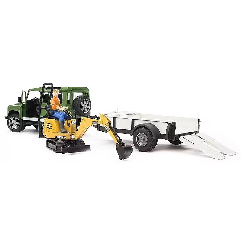 Description - Bruder 02593 Land Rover with a 1-person trailer, JCB micro-excavator and a construction worker figure It has the typical Bruder toy features: Highest quality of workmanship Perfect reproduction Functionality For playing indoors and outdoors. An excellent educational toy, the main features of which are: Opening side and rear doors and engine hood Folding mirrors Off-road suspension Swivel front axle Extended steering wheel for easy maneuvering, which can be hidden in the chassis Tow bar Removable seats Possibility of attaching a winch to the front or rear Rubber tires with tread