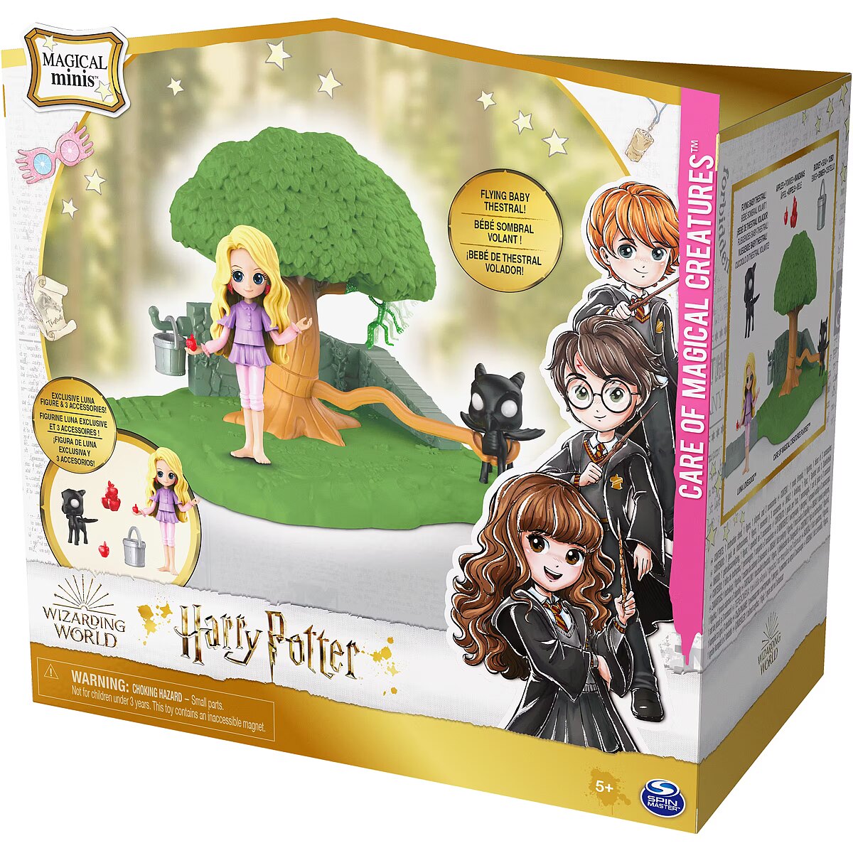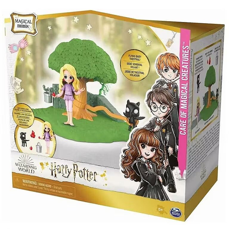 LongDesc - Imagine caring for creatures from the Wizarding World with Luna Lovegood and the Magical Minis Care of Magical Creatures Playset! Featuring an exclusive 3-inch Luna Lovegood doll and three themed accessories including a flying baby Thestral, young witches, wizards and Muggles can recreate their favorite Harry Potter scenes with this fun playset. Attach the baby Thestral to the tree trunk and fly it all the way around the tree! Then grab the hanging bucket from its hook and feed the Thestral the included apples – Luna can even hold an apple in her hand. Next, find creatures hiding in the tree. Move Luna over the activation spot and the Bowtruckle magically pops out of the tree! The Magical Minis Care of Magical Creatures Playset is the perfect way to inspire your imagination through fun and exciting pretend play. Connect the playset to the outside of the Magical Minis Hogwarts Castle (sold separately) using the included path connector and expand your Magical Minis small dolls world with the Potions and Charms Classroom Playsets (doll playsets each sold separately). Collect and connect all of the Magical Minis dolls, Friendship Sets and playsets to build out your own Wizarding World (each sold separately)! Magical Minis Harry Potter toys for girls and boys are the perfect gifts for kids and Harry Potter fans who enjoy collectibles, small toys, and dolls & accessories. Experience the magic of Harry Potter with the Wizarding World Magical Minis Care of Magical Creatures Playset!Includes: 1 Playset, 1 Figure, 3 Accessories, 1 Path Connector, 1 Instruction Sheet