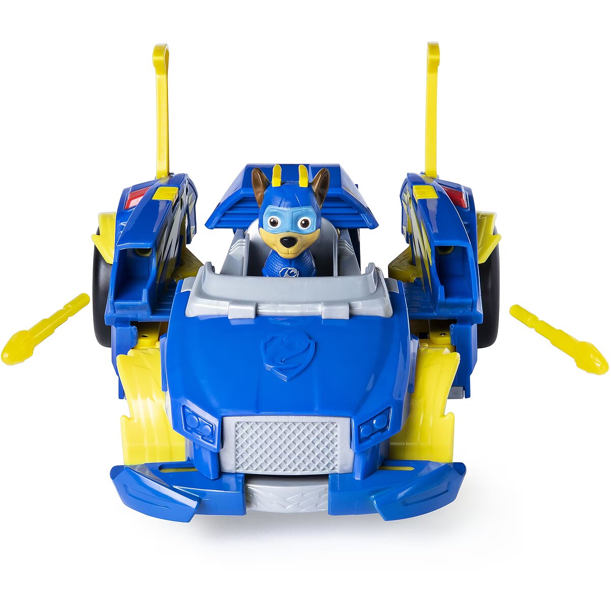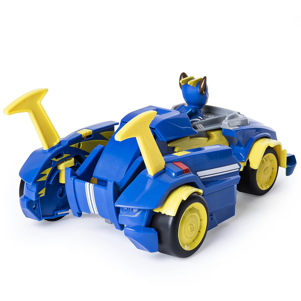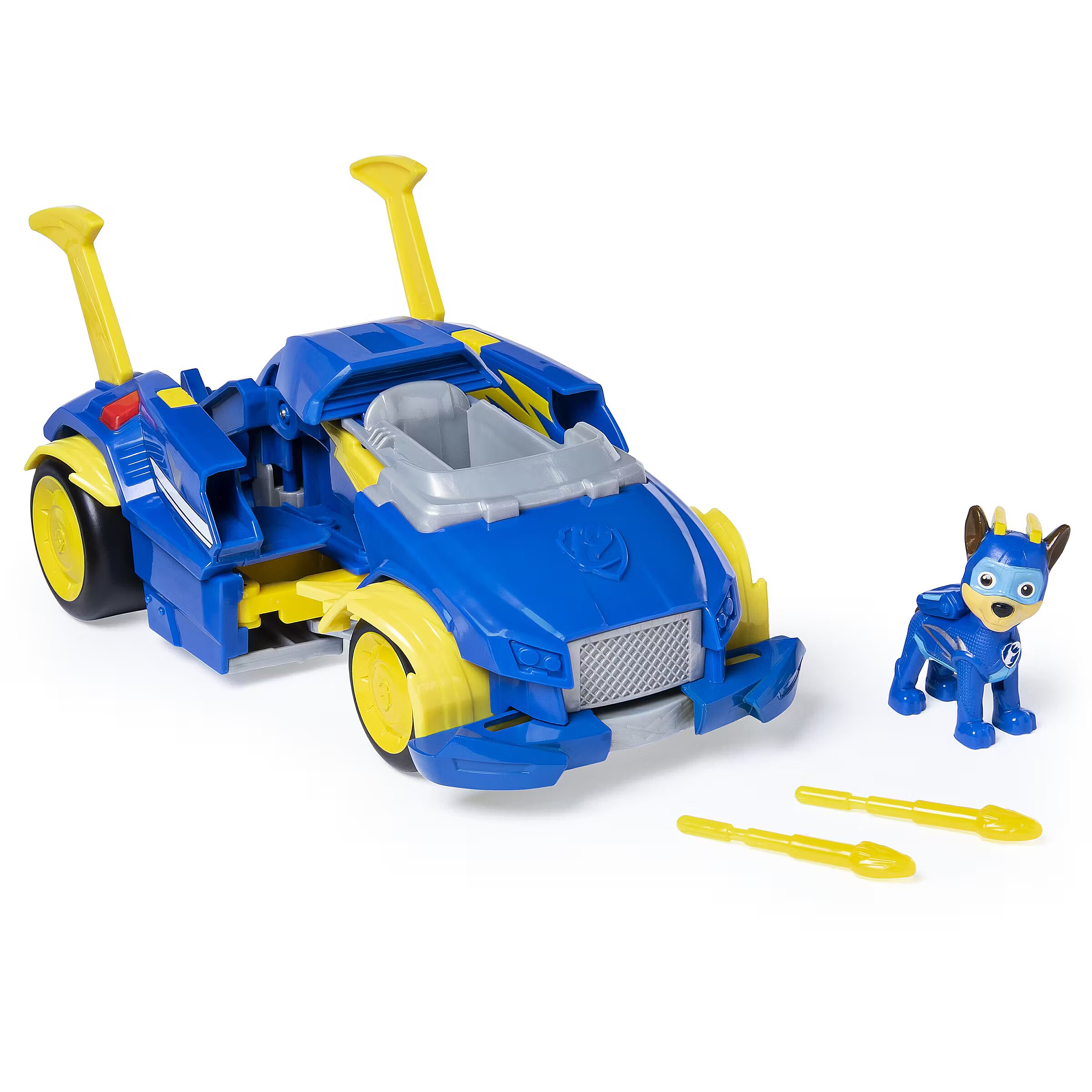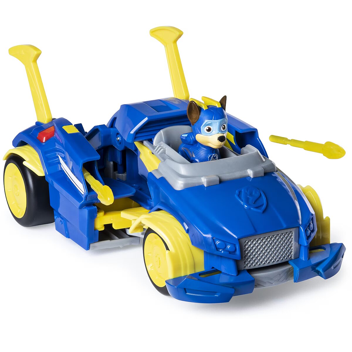 LongDesc - Power up to save the day with the PAW Patrol Powered Up Vehicles! Join Chase (figure included) on action-packed superhero rescue adventures with his transforming Powered Up Cruiser! With a lightning bolt spoiler and realistic details, this transforming vehicle is ready for high-speed rescues. When trouble strikes, switch Chase’s cruiser into power mode. Simply push down on the spoiler: the sides of the vehicle expand, revealing yellow lightning bolt detailing on the sides of the vehicle; translucent detailing around the wheels and dual projectile launchers inside the wheel wells! Chase and his Powered Up Cruiser are ready for anything that comes their way – launch the projectiles to take down obstacles! Once you’ve saved the day, pull up on the spoiler to fold the cruiser back into Mighty Chase’s deluxe vehicle. For additional pup backup, add Mighty Marshall and his Powered Up Fire Truck (sold separately) to your rescue adventures! Supercharge for awesome rescue missions with Mighty Pups Super PAWs Chase and his Powered Up Cruiser!Includes: 1 Mighty Pups Super PAWs Chase Figure, 1 Powered Up Cruiser Vehicle, 2 Projectile Launchers, 1 Instruction Sheet