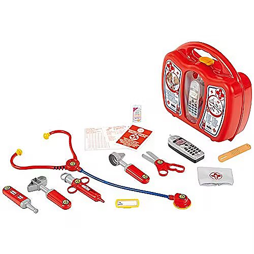 Description - KL 4350 Doctor's set with mobile phone The set with cell is one of the most impressive of the entire medical series. It contains complete and essential equipment for every medic. The red case is made of very durable plastic, has a comfortable carrying handle and a yellow clip to prevent it from opening. On the front, under the transparent lid, there is a toy mobile phone which must always be at hand. This set contains up to 14 pieces. All the pieces are, of course, child-safe and easy to use. The case contains a red and blue plastic stethoscope, a toy mobile phone (batteries required, which are not included), a syringe, a thermometer, scissors, an otoscope, a hammer, a plaster, a badge, a nurse's bandage, a box for bandage pads, a prescription, a medical measurement card. The series of doctor's kits and accessories on the one hand serves the purpose of playing doctor or nurse, and on the other hand helps children become familiar with the topic of visiting the doctor, the examinations and procedures performed. There is a wide range of sets with more or less accessories, as well as a number of individual products such as doctor's gowns and stethoscopes. The entire series is visually designed so that both boys and girls can play with it.