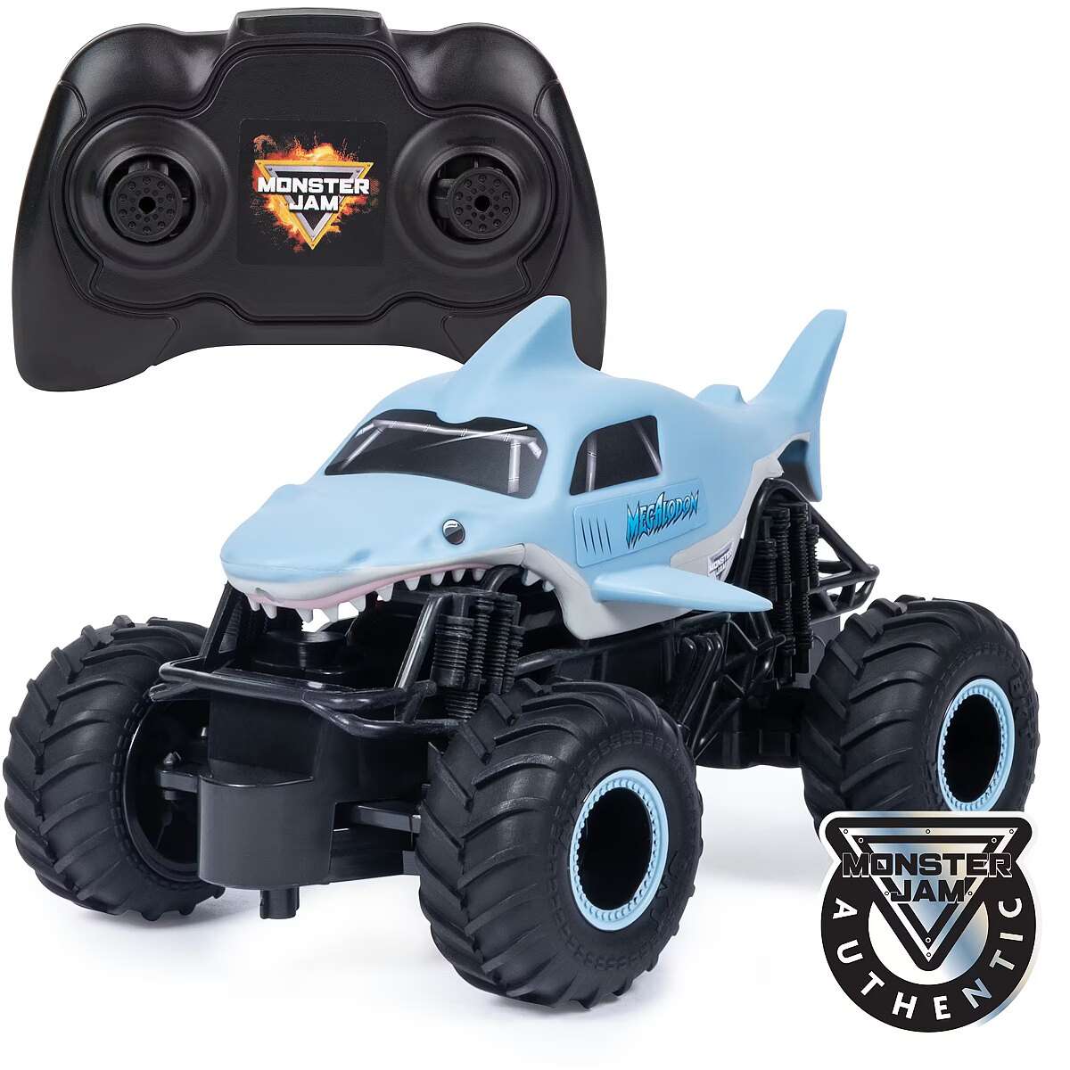 LongDesc - From the depths of the prehistoric ocean rises the all-new, official Monster Jam 1:24 scale Megalodon RC! This powerful predator lashes about to perform epic stunts, crazy crashes and brutal bashes! Featuring 2.4 GHz, you can race up to 6 Monster Jam trucks at a time! Now it’s even easier to host your own high-flying Monster Jam rally with your friends! And with a range of up to 250 ft., this prehistoric shark can travel farther in search of puny prey to pulverize! Nothing will stop it from dominating the Monster Jam circuit! Authentically styled, this 1:24 scale Megalodon remote control comes with official BKT Tires and a look-alike chassis, making sure this giant shark always delivers big fun! The all-new Megalodon RC is like driving the real thing! Catch this prehistoric beast and perform high-flying, gravity defying stunts like big air, donuts, cyclones and more! You’ve never been this close to the Monster Jam action than with the all-new, official Monster Jam 1:24 scale Megalodon RC!Includes: 1 x Monster Truck, 1 x Controller, 1 x Instruction Guide