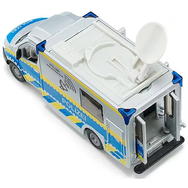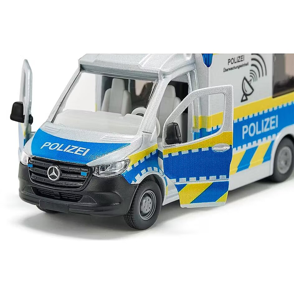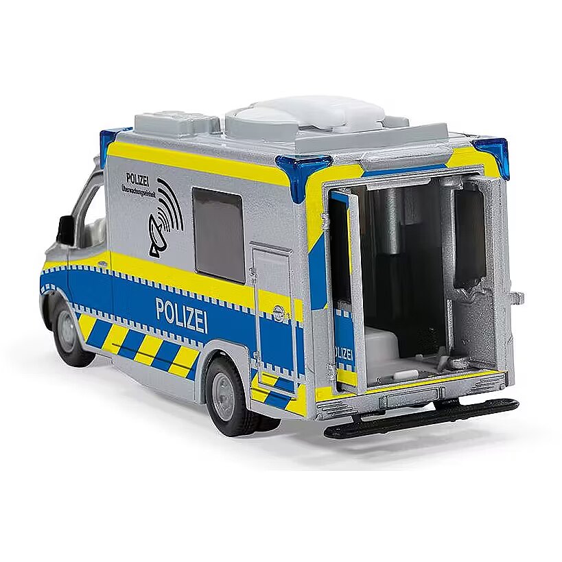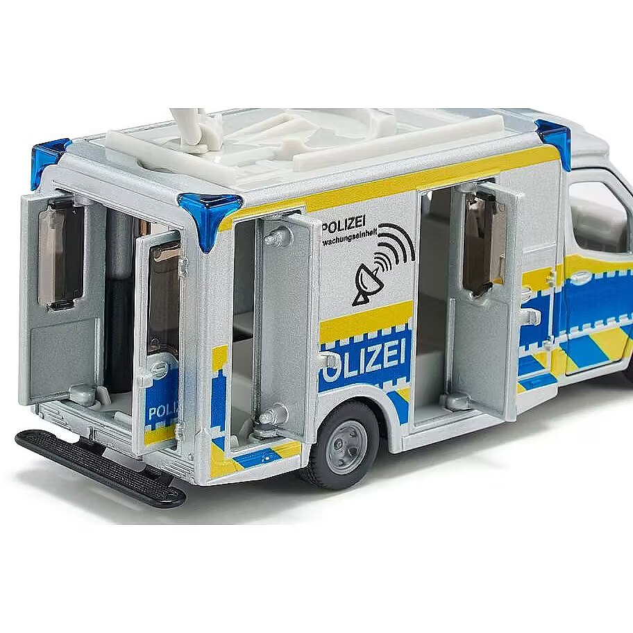 LongDesc - The more complex the police operation, the more important is reliable communication between the task forces. Interaction by satellite communication functions rapidly and smoothly, even in crisis or catastrophe situations. The siku police Sprinter from Mercedes Benz is provided with the appropriate equipment. A rotating satellite dish on its roof can be folded down during travel. The doors on both sides of the driver’s cab can be opened, as can the two doors on the right hand side and at the rear. The corners of the box body are marked by four blue lights. The typical silver/blue colouring of the Police Sprinter is complemented by all-round yellow signal marking, as well as “Polizei” and “Polizei Überwachungseinheit” lettering.