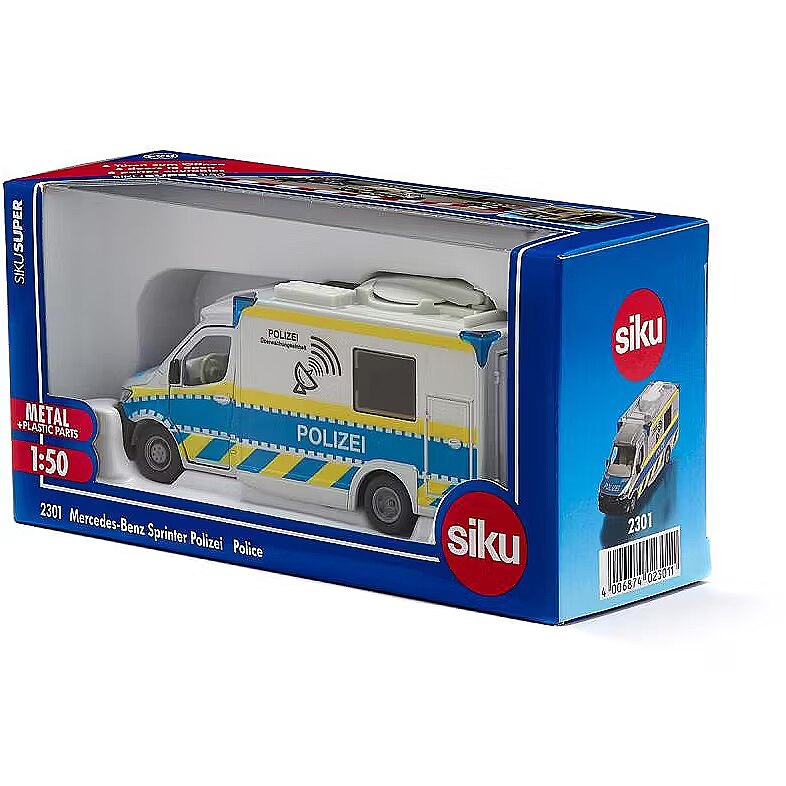 LongSummaryDescription - Siku Mercedes-Benz Sprinter Police. Product type: Police car model, Construction type: Preassembled, Scale: 1:50. EU TSD warning: Not for children under 36 months. Width: 55 mm, Depth: 124 mm, Height: 47 mm. Package width: 59 mm, Package depth: 175 mm, Package height: 87 mm