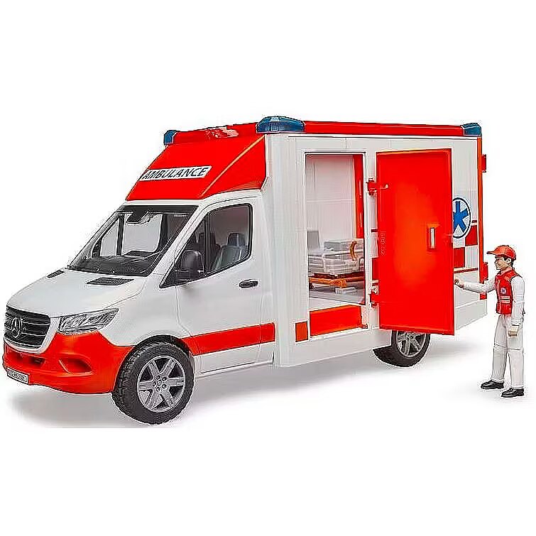 Description - BRUDER 02676 ambulance with rescue figure. Emergency vehicles play an important role at Bruder. The new MB Sprinter ambulance has been added to complete this range. The new ambulance from Bruder is equipped with a range of realistic features. Included is a paramedic in professional attire who can enter the cab through the opening door. Thanks to the new integrated light and sound module with various siren signals and light functions, the ambulance can reach the scene quickly and safely. The small rescuer has access to the ultra-modern treatment area via the opening rear and side doors and the removable roof module. On the height-adjustable stretcher, which can be pulled out and retracted, there is room for each bworld figure for treatment and can be transported safely. Other Bruder models, i.e. the accessory set 62710, consisting of a paramedic and a patient, as well as the bworld infirmary (item no. 62711), fit thematically with the toy. The toy features: Soft moulded rubber tread Opening driver's cab door Glazed cab Lifeguard figure included Opening cab side door with fold-out steps Retractable and extendable stretcher on trolley Removable roof for easy access to ambulance compartment Trailer can be attached Built-in light and sound module with four functions Side mirrors Fits all bWorld figures