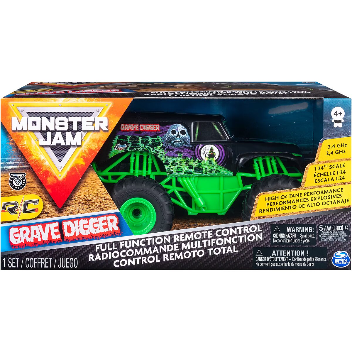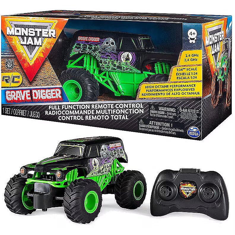 LongDesc - Take control of one of the most decorated Monster Jam trucks of all time! Introducing the all-new, official 1:24 scale Grave Digger RC! Dig in and drive this heavy-duty monster truck to the max to perform epic stunts, crazy crashes and brutal bashes! Featuring 2.4 GHz, you can race up to 6 Monster Jam trucks at a time! Now it’s even easier to host your very own Monster Jam rally with friends! And with a range of up to 250 ft., this 1:24 scale Grave Digger RC can dig in anywhere – make the world your very own Monster Jam arena! Authentically styled, this realistic Grave Digger remote control monster truck comes with official BKT Tires and a look-alike chassis, making sure this iconic truck always delivers big fun! Nothing will stop it from dominating the Monster Jam circuit! This Grave Digger RC is like driving the real thing! Perform high-octane stunts like big air, donuts, cyclones and more! You’ve never been this close to the Monster Jam action than with the official, all-new Monster Jam 1:24 scale Grave Digger RC!Includes: 1 x Monster Truck, 1 x Controller, 1 x Instruction Guide
