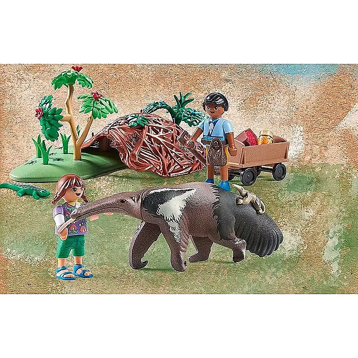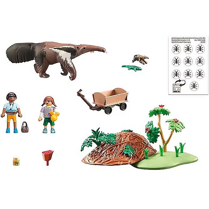 Accessories included - Figures: 1 boy, 1 girl; Animals: 1 anteater, 1 young anteater, 1 lizard; Accessories: 1 anthill with plants, 1 handcart, 1 animal food, 1 jam jar, 1 fanny pack, 1 sticker sheet 'ants', 1 knowledge card 'anteater'