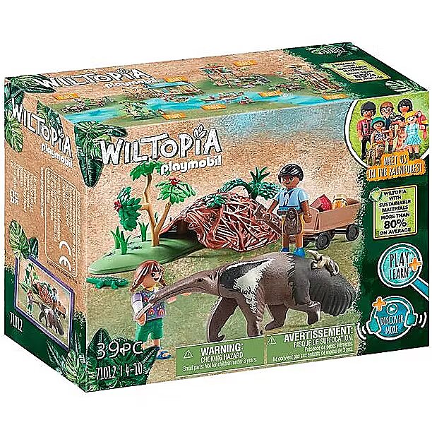 Technical_details - Type: construction toy EAN: 4008789710123 Manufacturer number: 71012 Series: Wiltopia Pieces: 39 pieces Contents/equipment: Figures: 1 boy, 1 girl; Animals: 1 anteater, 1 young anteater, 1 lizard; Accessories: 1 ant nest with plants, 1 wagon, 1 animal feed, 1 jam jar, 1 belt pouch, 1 sheet of stickers 'Ants', 1 knowledge card 'Anteater' Age recommendation: from 4 years to 10 years Target group: kindergarten children, school children Material: Plastic Warnings: Caution: Not suitable for children under 36 months! : Attention: Danger of suffocation due to small parts! Feature: For that extra portion of knowledge: The Wiltopia web app offers additional great audio and video content and takes children right into the habitat of the animals. Simply scan the QR code on the animal collection card and the detailed animal and plant world will come home. With the AR feature, a selfie with the anteater is also possible. This is how knowledge transfer works with fun and a learning effect. More information: Wiltopia - wonderful for the environment Wiltopia is the first PLAYMOBIL product range that consists of more than 80% sustainable material on average. Sorted out plastic waste is given a new life and serves as a source of material for this extraordinary game world. This saves resources and, above all, the environment. Of course, all Wiltopia products meet the usual high safety standards and the proven PLAYMOBIL quality and durability.