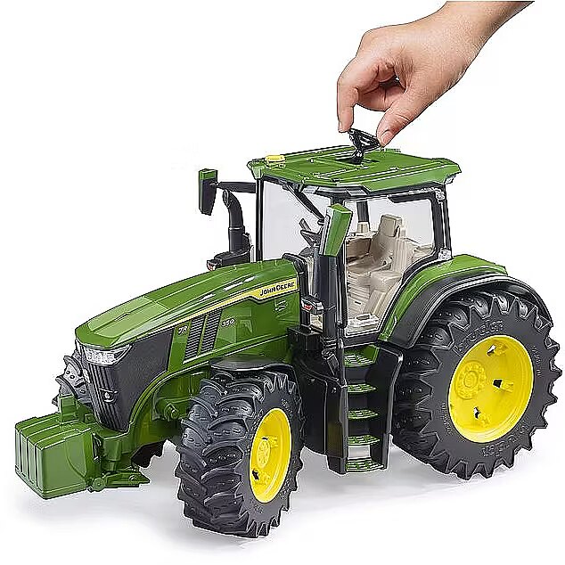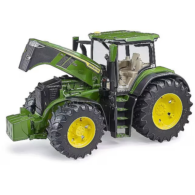 Description - John Deere 7R 350 tractor An excellent educational toy whose main features are: Extended steering wheel for easy manoeuvring Soft rubber tyres with tread Opening bonnet Opening cab doors Off-road suspension system Standard front and rear hitch Removable counterweight Loader attachment possible (order no. 03333) Compatible with bWorld figures and many Profi-series agricultural machines and trailers Features typical Bruder toy qualities: Top quality workmanship Perfect reproduction Functionality