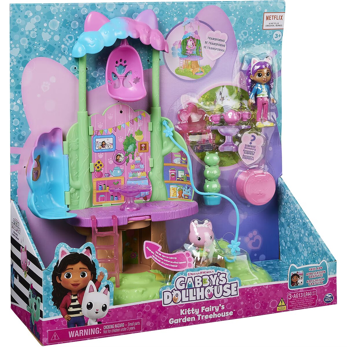 LongDesc - Bring your dollhouse world to life with Kitty Fairy in the Gabby’s Dollhouse, Garden Treehouse Playset! Inspired by the enchanted Cotton Candy Tree from the show, this lovely children’s Treehouse features lights, a transforming canopy, secret room, vine zipline, swing, figures, accessories and furniture pieces to play out your adventures! Explore the treehouse’s two floors with Kitty Fairy and an exclusive 3.5-inch-tall Gabby Girl figure. Discover a tree canopy that opens up to reveal a play area! Then, after exploring all the wonderful features, unbox your special Dollhouse Delivery, just like Gabby does in the show, and find a surprise watering-can accessory to use in your storytelling. After unboxing the Dollhouse Delivery, fill the Garden Treehouse with all the delightful fairy-themed furniture and accessories, including a swinging petal chair, a ladder to reach the second floor, a chair and dining table for garden tea parties, a cat topiary that you can spin and more! There’s also a thumbwheel built into the floor – spin it to find a secret room in the trunk of the tree and watch as the trunk and table light up (batteries included)! Slide Kitty Fairy down the vine zipline from the top floor to the ground floor and hook the zipline to the outside of Gabby’s Purrfect Dollhouse (sold separately)! Then, for one last surprise, scan the QR code inside the Dollhouse Delivery to unlock a special reward in the free Gabby’s Dollhouse App (available on iOS and Android). After a fun-filled day of pretend play, close the tree canopy and store all your wonderful treasures inside. This treehouse is the ultimate gift for kids aged 3 and up. Discover the magic of the Gabby’s Dollhouse with Kitty Fairy’s Garden Treehouse Playset!Includes: 1 Kitty Fairy’s Garden Treehouse Playset, 2 Figures, 3 Furniture Pieces, 1 Dollhouse Delivery, 5 Accessories, 1 Instruction Sheet