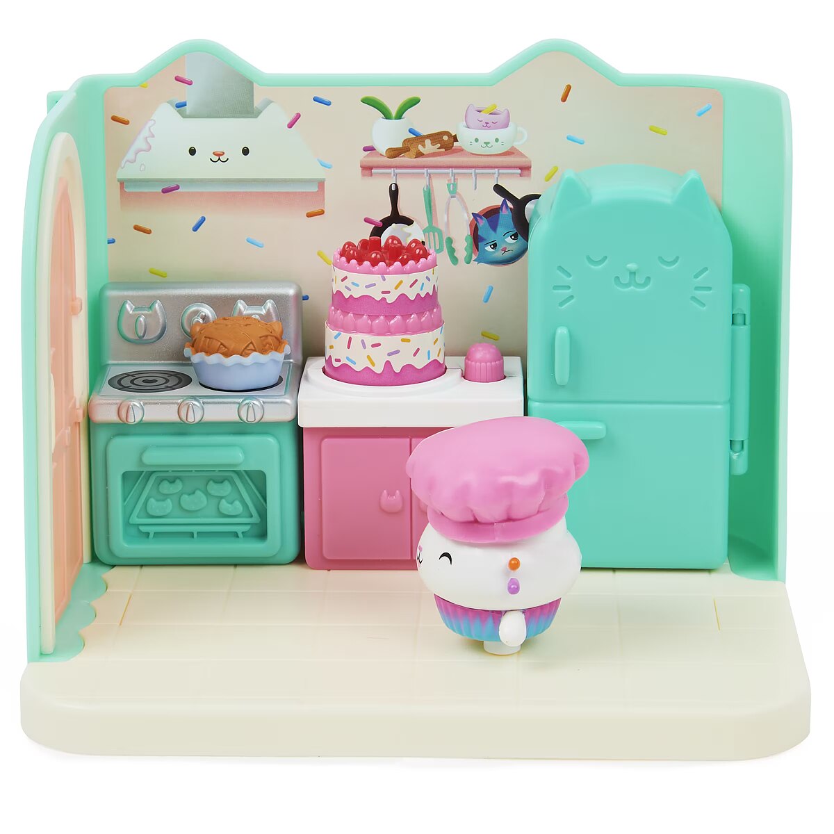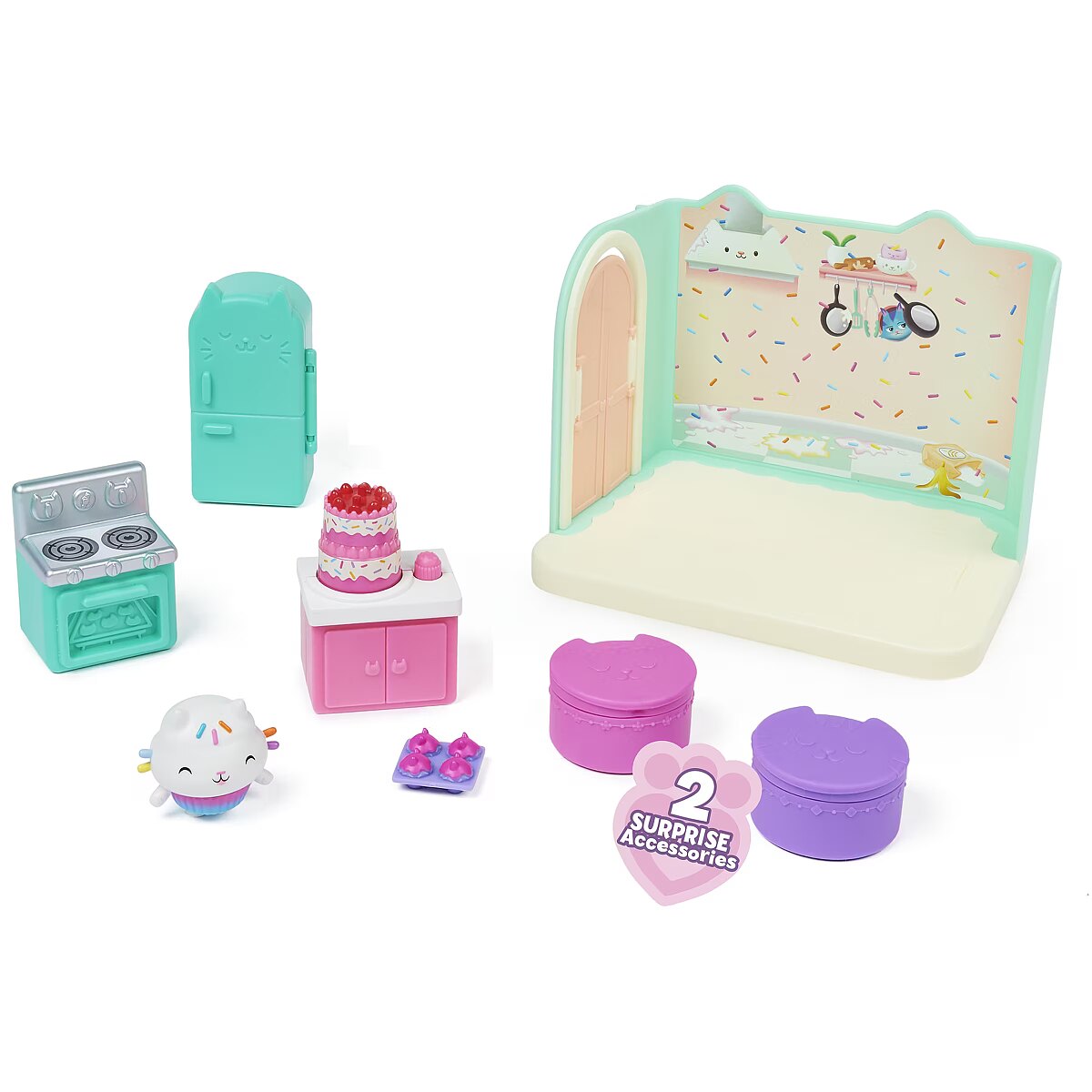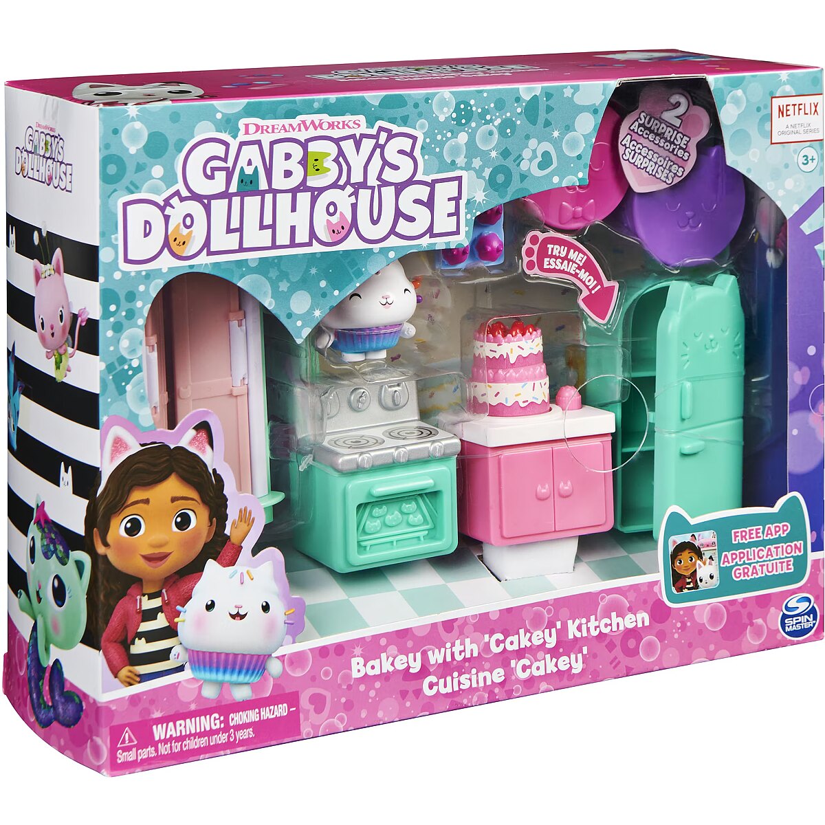 LongDesc - Bake up a storm with Cakey Cat in the Gabby’s Dollhouse Bakey with Cakey Kitchen! This deluxe Gabby’s Dollhouse playset is filled with fun details and surprises to explore, bringing the magical room from the show to life. Open up the box to find a Cakey Cat collectible figure, three furniture pieces, a tray of cupcakes accessory, plus two Dollhouse Delivery boxes with two more surprise accessories! Just like Gabby does in the beginning of each episode, unbox your special Dollhouse Deliveries and discover the set’s mystery accessories: a pie and a chef hat that Cakey can really wear! Place the hat onto Cakey and whip up some yummy treats at the oven. When they’re finished baking, store the pie and cupcakes in the kitty fridge – the door really opens! Then, set Cakey on top of the cake and press the button to make it spin for a sprinkle party! It’s so much fun! With so many features, the Bakey with Cakey Kitchen is perfect for exciting pretend play and makes a great gift for kids. Use it with MerCat’s Primp and Pamper Bathroom and Pillow Cat’s Sweet Dreams Bedroom (each sold separately) to build out your Gabby’s Dollhouse world. Plus, you can even slide the room right into Gabby’s Purrfect Dollhouse (sold separately) for more ways to play out your dollhouse adventures! For one last surprise, scan the QR code found inside one of the Dollhouse Deliveries to unlock a special reward in the free Gabby’s Dollhouse App (available on iOS and Android). Get Cakey Cat ready for a sprinkle party with the Gabby’s Dollhouse Bakey with Cakey Kitchen!Includes: 1 Room, 1 Figure, 3 Furniture Pieces, 2 Dollhouse Deliveries, 3 Accessories, 1 Instruction Sheet