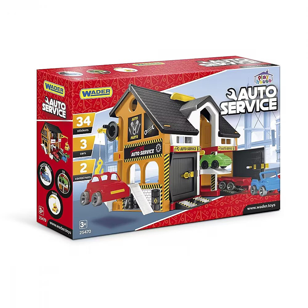 Description - Play House Auto Service Bring the car workshop to your childs playroom! Oil changes, pump repairs, suspension fixes, or full vehicle inspectionsjust drive in, and the young mechanic will take care of it! The workshop features two service stations, ramps, lifts, and an elevator, all designed to create a realistic repair shop experience. Waders Play House series introduces children to real-world environments while allowing them to explore different professions. Play House Auto Service is a two-story garage with multiple moving parts, including opening doors, an elevator, and a crane. The set also includes three cars, ramps, and 34 stickers for extra customization. Playing begins right from the moment of assembly, making it an engaging and educational experience. Assembling the workshop promotes logical thinking and problem-solving skills while also developing imagination, visual-spatial intelligence, and fine motor skills. Key Features: Realistic two-story auto repair station with moving parts Includes 3 cars, ramps, and 34 stickers for customization Develops creativity, problem-solving, and role-playing skills Supports fine motor skills and spatial intelligence Made from safe, durable, and non-toxic materials Portable design with a convenient carry handle for easy transport Let your child dive into the world of mechanics and enjoy endless hours of fun!