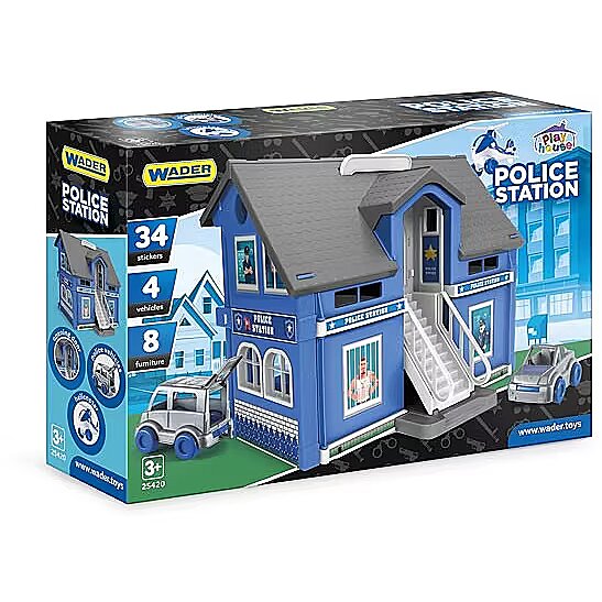 Description - The two-story Police Station house from the Play House series is a reproduction of a real large police station with a detention center, interrogation room, police vehicles and a scout helicopter. The set includes furniture for individual rooms, 4 vehicles and a set of 34 stickers for self-sticking. The Police Station from the Play House series gives you a lot of opportunities to play catch criminals and keep order and safety on the streets. All elements of the Police Station from the Play House series are made of durable materials, safe for children from 3 years of age. The house has been additionally equipped with a handle mounted on the roof, thanks to which it can be easily moved to any place. The Police Station from the Play House series is another proposition for lovers of role-playing and having fun in many ways with the use of imagination. Quick and effective police actions, catching criminals red-handed, interrogations lasting several days, putting criminals behind bars and ensuring the safety of residents all this will be ensured by playing with the Police Station. Law enforcement officers have at their disposal a detention center, an interrogation room, service rooms and a driveway for police cars. Themed houses from the Play House series bring children closer to the surrounding reality, as well as enable them to learn about various professions. The two-story Police Station house from the Play House series is a reproduction of a real large police station with a detention center, interrogation room, police vehicles and a scout helicopter. The set includes furniture for individual rooms, 4 vehicles and a set of 34 stickers for self-sticking. The Police Station from the Play House series gives you a lot of opportunities to play catch criminals and keep order and safety on the streets. All elements of the Police Station from the Play House series are made of durable materials, safe for children from 3 years of age. The house has been additionally equipped with a handle mounted on the roof, thanks to which it can be easily moved to any place. Playing with this product begins from the moment of assembling the elements of the service, it is an interesting and engaging task, as well as having an impact on the childs development and the ability to think logically. Both during the assembly and the game itself, the toddlers imagination and visual-spatial intelligence develop. The development of psychomotor functions and manual skills is also crucial. All elements of the toy are made of safe, durable materials, moreover, the product does not have sharp edges and edges. The elements of the house connect to each other in a simple and durable way, which guarantees that nothing will disturb the child during great fun. Thanks to the handle attached to the roof, the toy can be easily moved to any place. two-story house police station with dimensions of 37 cm x 30 cm the set includes a house with windows, opening doors, 4 vehicles, driveways and 8 pieces of furniture: 2 x stool, 3 x armchair, 2 x table. 1 x sideboard the handle on the roof makes it possible to move the house freely to any place all elements are safe for children, made of durable materials a set perfect for playing with several people at the same time: children with adults or peers; also attractive for independent play playing with the product stimulates the childs imagination and creativity, promotes the development of psychomotor functions and develops his manual skills intended for children 3+
