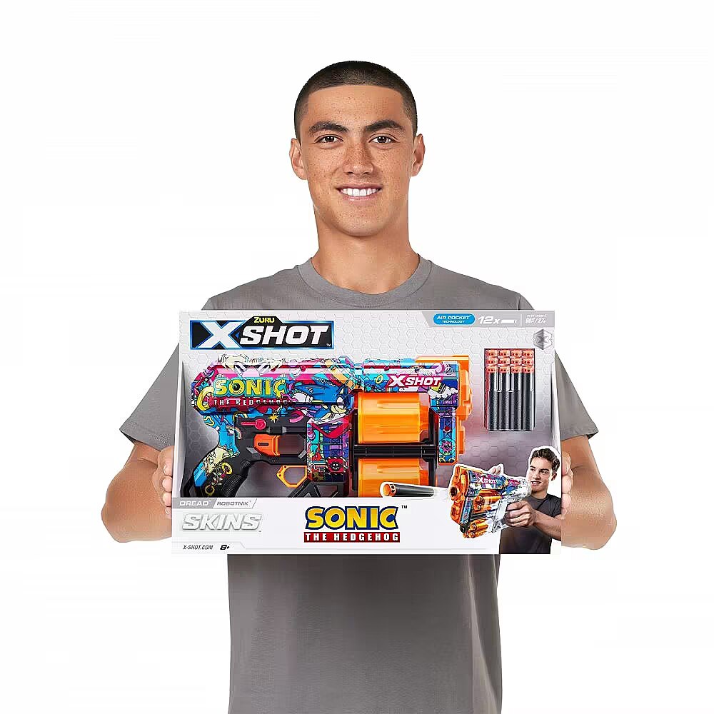 LongDesc - XSHOT SKINS DREAD Robotnik Sonic The Hedgehog Blaster (12 Air Pocket Technology Darts) ZURUSkin your blaster with the super speed of Sonic the Hedgehog! XSHOT SKINS DREAD blaster features a double trouble rotating dual barrel meaning you are always locked and loaded for fun. When you run out of darts in one barrel, switch over to the second one and blast your competition away! The DREAD can hit targets up to 27m / 90 feet away and has a 12 dart capacity. Go NEXT LEVEL with XSHOT and collect all 6 Sonic the Hedgehog Skins!