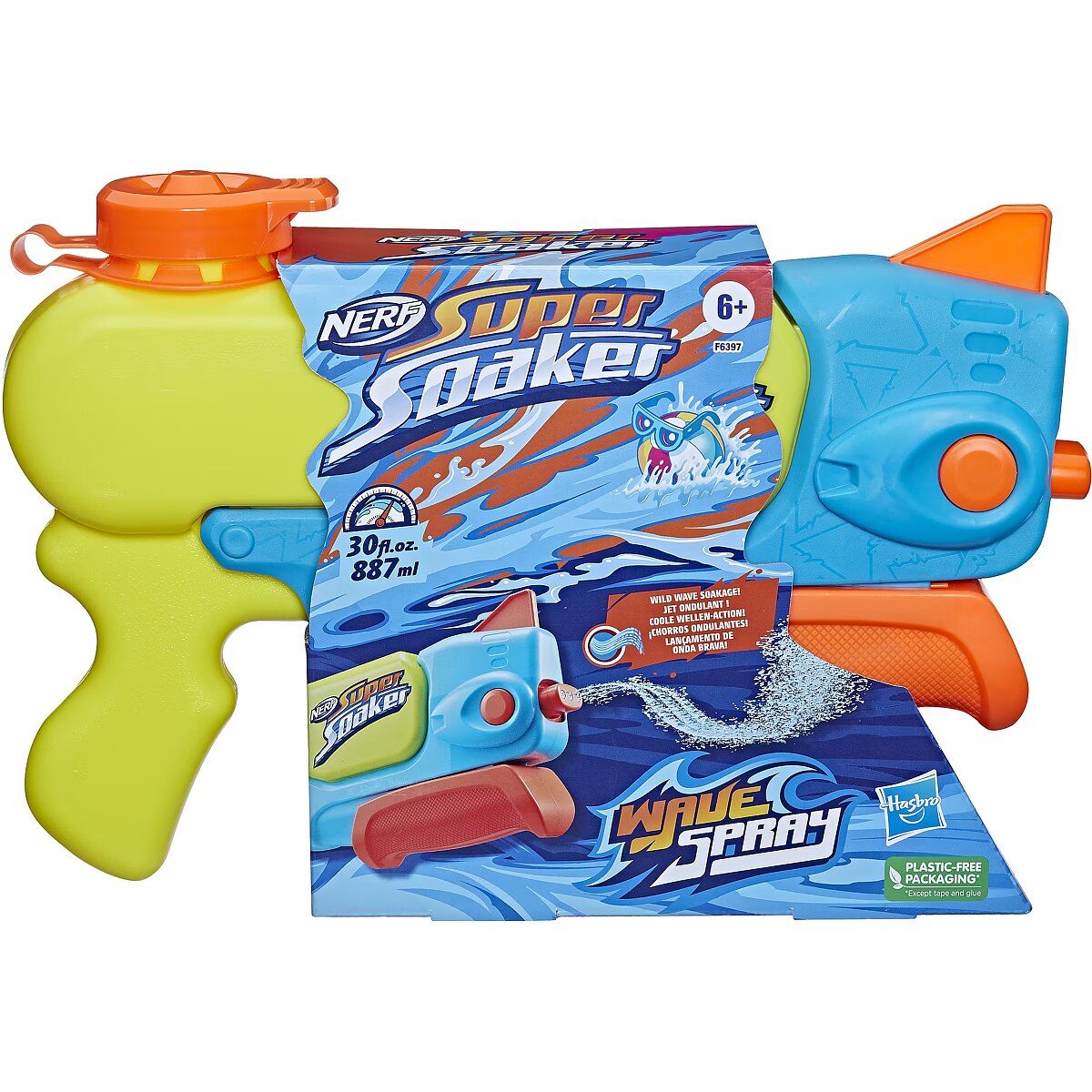 LongDesc - Wild wave soakage! The Nerf Super Soaker Wave Spray water blaster unleashes a wave of water that goes up and down in a cool wavy motion! The nozzle moves as you pump the blaster, creating awesome wave action that drenches everyone in fun outdoor games. Head outside for backyard fun with the Nerf Super Soaker Wave Spray water toy blaster that's a great gift for 6 year old boys and girls, and waves of fun for teens and adults. Easy to use! Fill the tank and pump the handle back and forth to start soaking friends and family. Each tank holds up to 30 fluid ounces (887 milliliters). The Nerf Super Soaker brand has been pouring on the fun since 1989 and continues to drench everyone with water-blasting mayhem! Head outdoors for extreme soakage with Nerf Super Soaker blaster outdoor toys! Nerf and all related properties are trademarks of Hasbro.