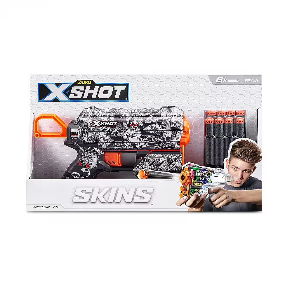 LongDesc - XSHOT Skins Flux Dart Blaster - Illustrate Skin (8 Darts) ZURUXSHOT Skins brings the in-game experience of skinning your blaster into the real world, choose your Skin and join the battle. Jump straight into the action with the XSHOT Skins Flux blaster. With a single dart capacity and 2 dart front storage, the easy to reload mechanism means you’re always ready for battle. The Flux can hit targets up to 27m / 90 feet away and recoils after every single shot for maximum power. Make sure you take down your enemies before they take you! XSHOT Skins darts include new air pocket technology for a faster, further, and more accurate blast.Choose different, choose XSHOT Skins.