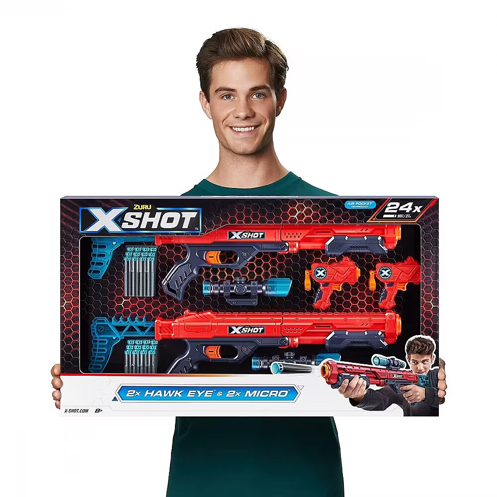 Description - X-Shot X-Shot Excel Double Hawk Eye & Double Micro Combo Launcher Kit Take active fun to a whole new level with the X-Shot Launcher Set! Make sure you win every thrilling matchup with the Excel Double Hawk Eye & Double Micro Combo launcher combo! It's a ton of opportunities to hit the target, aim shots and melee. Combine the accuracy of the reliable Hawk Eye with a detachable scope and gain an advantage by taking advantage of the compactness of the smaller Micro Combo launcher! Enemies won't stand a chance... The set of four toy Excel Double Hawk Eye & Double Micro Combo launchers for even more exciting X-Shot battles. The set includes two Hawk Eye launchers to which you can attach a scope to hit targets up to 27 meters away. The smaller Double Micro launchers allow you to use the stealth ability and are ideal for melee duels. Twin copies of the toy guns make the set fantastic for siblings or two friends. The X-Shot Excel Double Hawk Eye & Double Micro Combo launcher set is a fantastic way to treat yourself to exciting active fun at the highest level. The pack contains 2 x Excel Hawk Eye X-Shot Launcher and 2 x Excel Micro X-Shot Launcher. Also includes ammunition for 24 X-Shot foam darts. The toy encourages children to play actively outdoors, move and develop their imagination thanks to interesting accessories and refined, realistic details in the style of the X-Shot launcher. Launcher set designed for children aged 8 years and over.