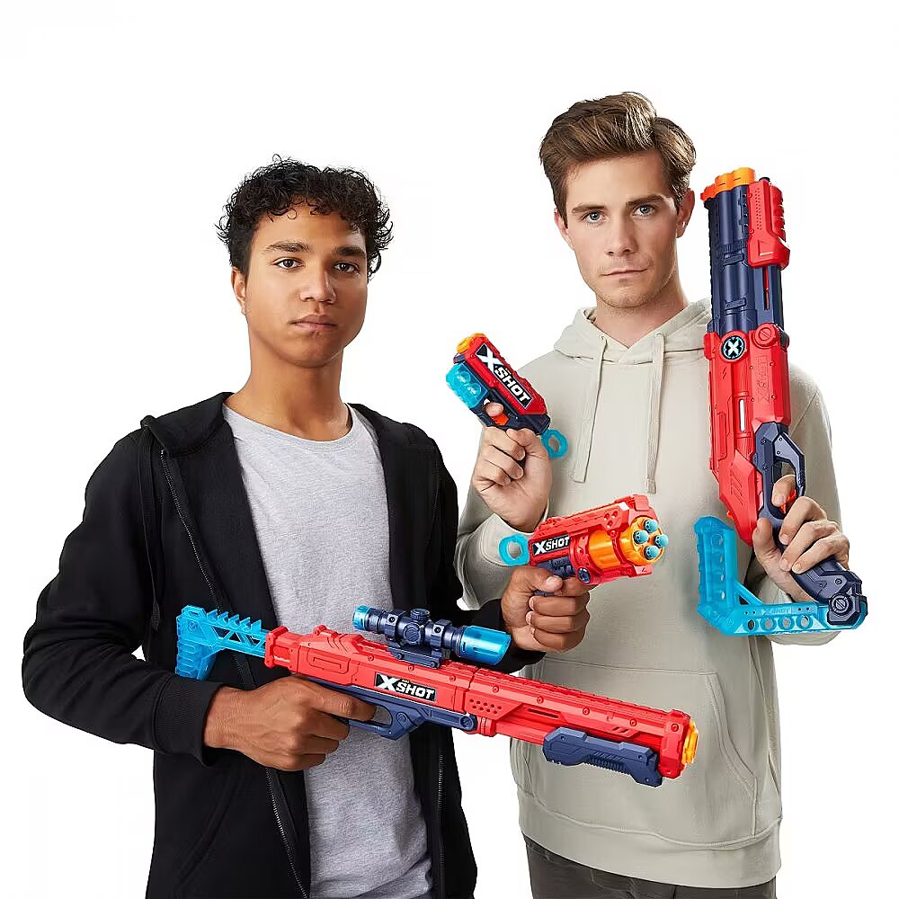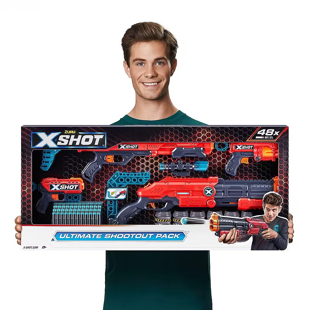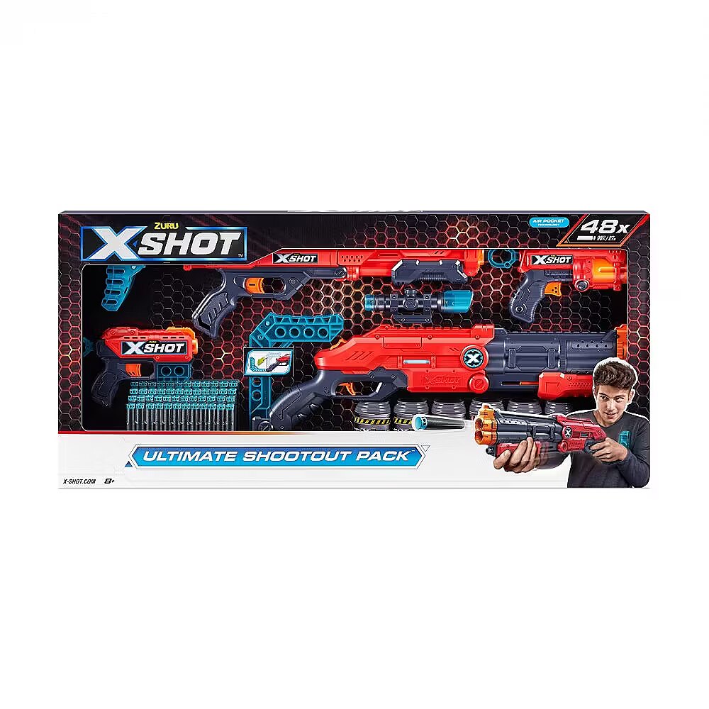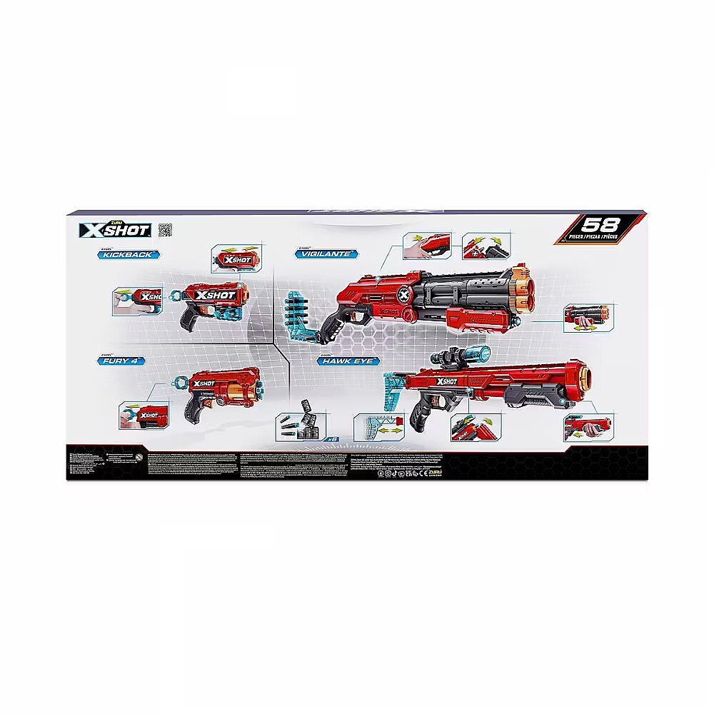 Description - Elevate your game with the X-Shot Excel Ultimate Shootout Pack. This pack contains everything you need for an epic battle. The Vigilante Shotgun-style launcher and precision Hawk Eye feature break 'n load and pump-action. Destroy enemies with the Fury 4 with its auto-spinning magazine and recoil effect that you can feel with every shot. All launchers shoot up to 27m. Your opponents won't stand a chance. Ready for any battle: The X-Shot Excel Ultimate Shootout Pack includes 4 launchers to cover all your combat needs, including stealth, sniping and melee combat! All launchers in the X-Shot Excel Ultimate Shootout pack can hit targets up to 27m away.