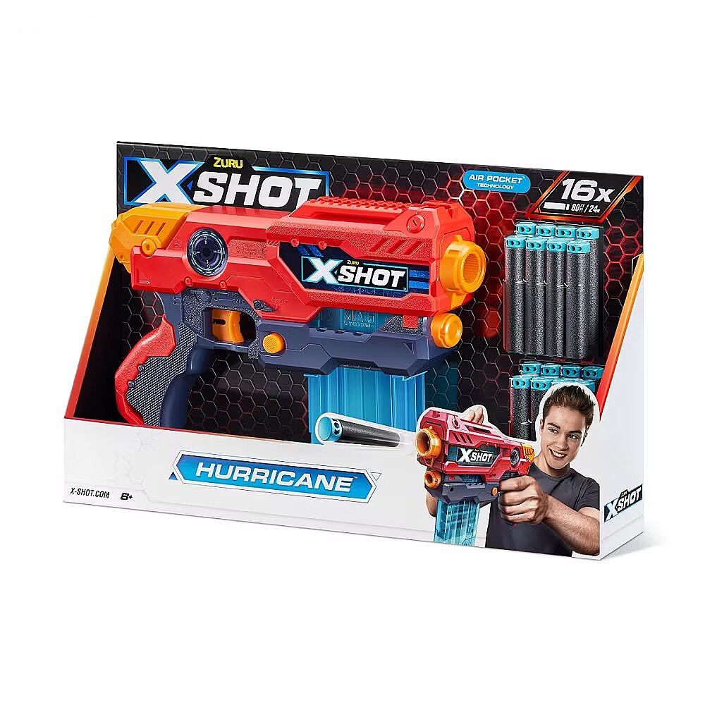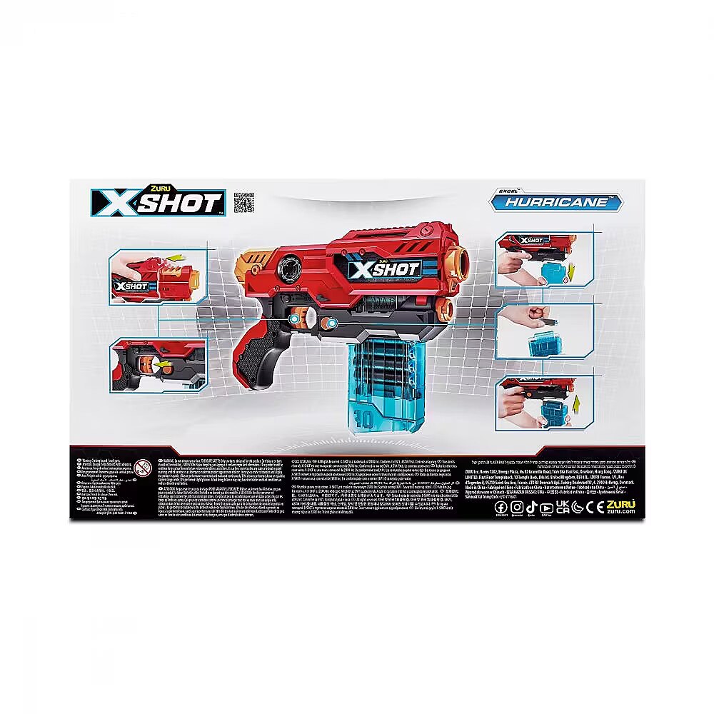 Description - X-Shot Excel Hurricane launcher Shot Excel Hurricane will bring a storm of darts down on your opponents! Load a 10-dart magazine and fight the enemy at a range of up to 24 m. With the distance and power of the Hurricane, you will be unstoppable in any battle. When you run out of darts, simply remove the magazine and refill it easily. Get back in action and put your opponents in a tough battle with the X-Shot Excel Hurricane Launcher! Range: The X-Shot Excel Hurricane can hit targets up to 24m away.