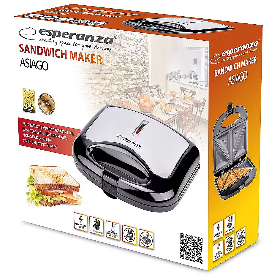 Description - Sandwich toaster ASIAGO 1000W The Esperanza ASIAGO toaster has non-stick coated plates. It can be easily cleaned even with a paper towel only. Thanks to fast heating, it allows you to prepare your dream sandwich in just a few minutes. If you want to eat a tasty sandwich every morning, welcome. Enjoy your meal!