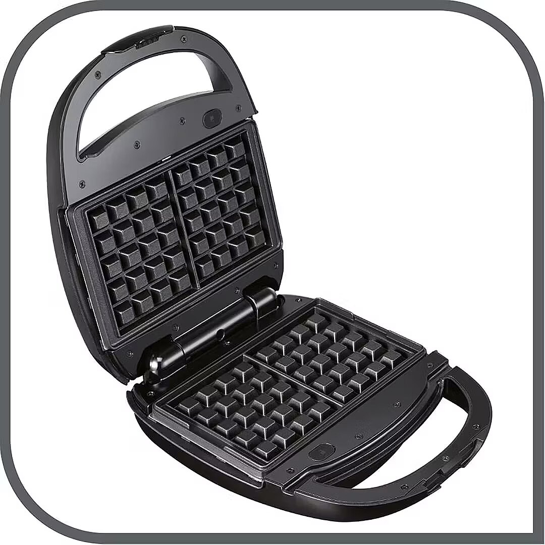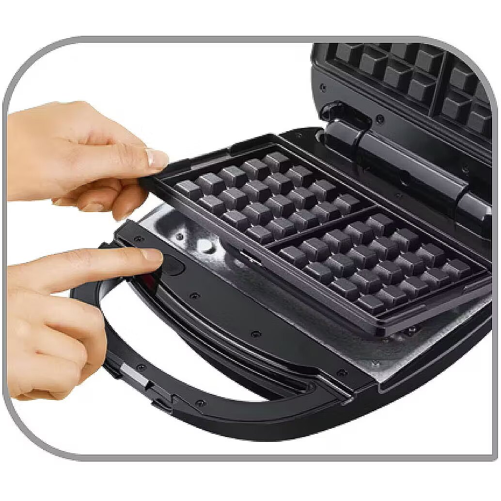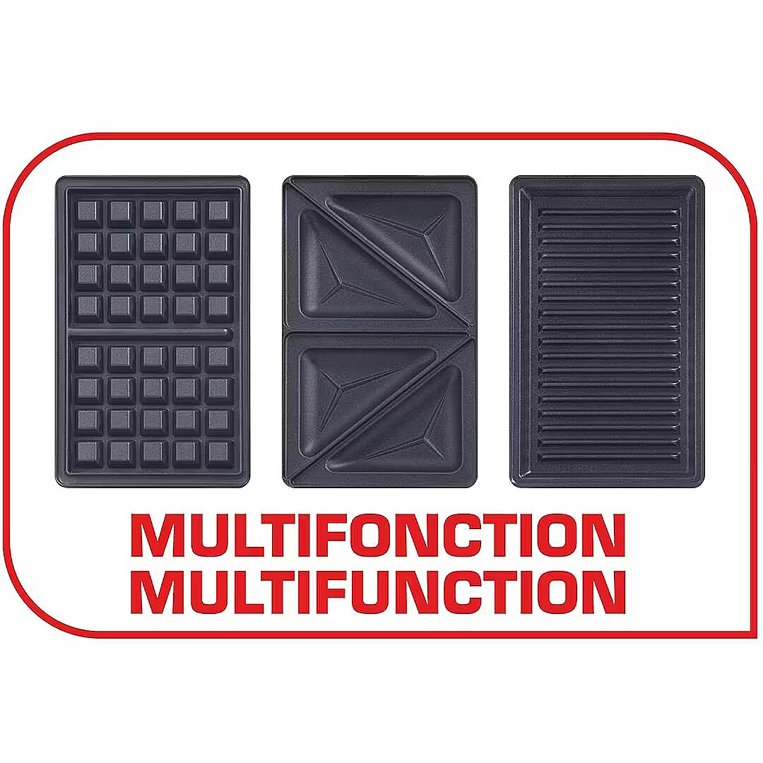 Three removable sets of plates for waffles, paninis and triangular toasted sandwiches.