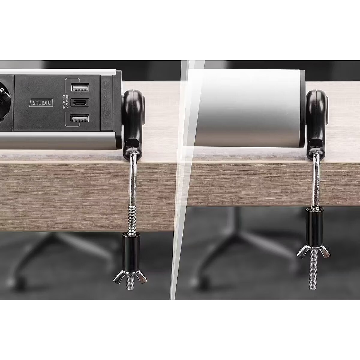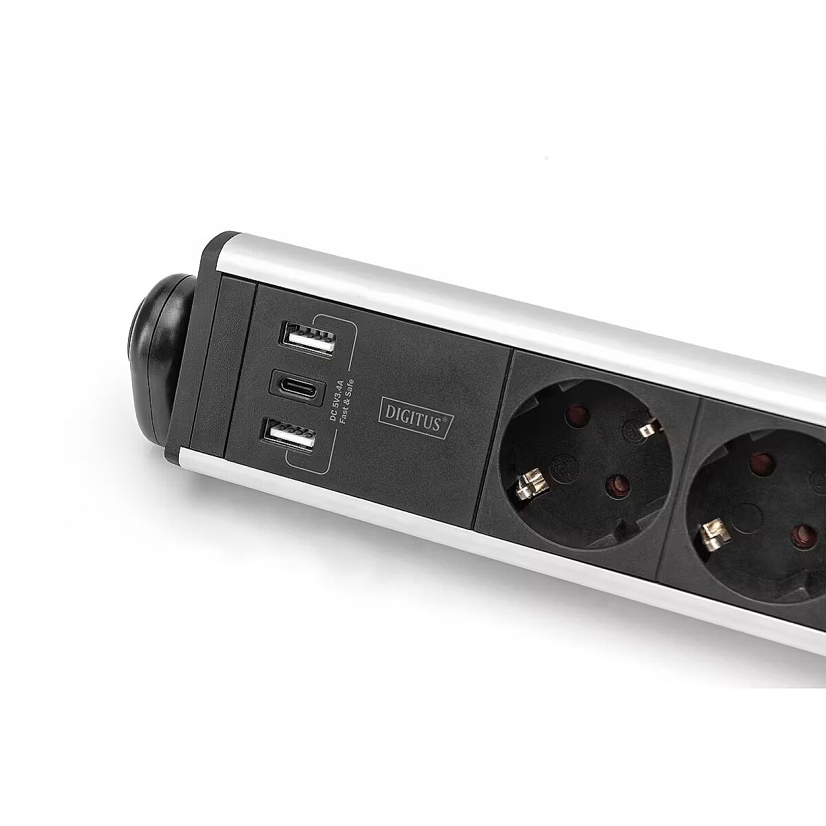 Description - A power strip with three USB charging ports for mobile devices in a high-quality aluminum housing Forget about situations when you had to constantly look for a smartphone charger. The DIGITUS office power strip offers 3 USB ports with which you can, for example, charge a smartphone and a tablet at the same time. You can use electrical sockets with a protective contact without connection problems. The intelligently designed 45° tilt allows the use of even larger power supplies and bulky right angle plugs without blocking or covering adjacent sockets. In addition, it is possible to position the power strip in various ways and, if necessary, adapt it perfectly to a given location using a plug-in clamp mounted on both sides. Once clamped, the power strip can be rotated horizontally for optimal flexibility of use. Protect yourself and your family from electric shock with integrated covers and increased protection against accidental touching of electrical sockets with protective contacts. The 1.5 m long power supply allows you to place the power strip according to your wishes. The casing made of high-quality aluminum complements the elegant appearance of this multifunctional power strip. 6 x 45° grounding contact socket, also suitable for bulky angled plugs 2 x USB A connector for charging mobile devices (18 W) 1 x USB-C connector for charging mobile devices (20 W) 2 x clamp attachments for different countertop thicknesses (20 mm - 57 mm) Can be rotated 180 degrees horizontally for optimal flexibility Illuminated safety switch for on and off