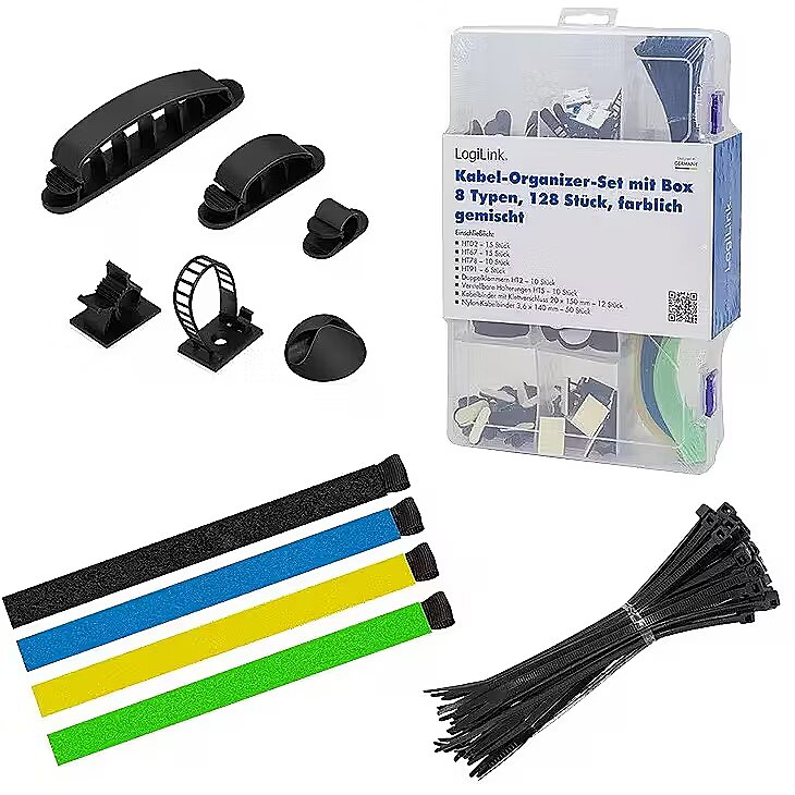 Description - Cable organizer set from LogiLink consisting of 8 different items (cable ties, cable clips and fasteners) in a transparent, clearly arranged transport and storage box.