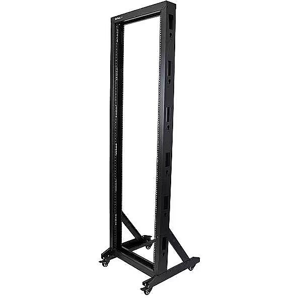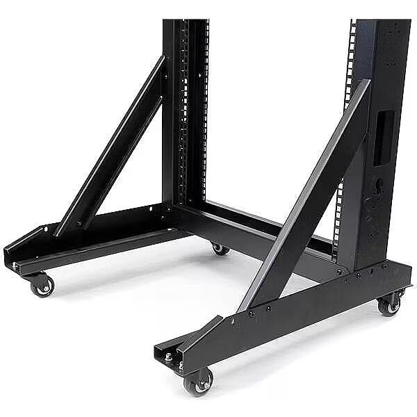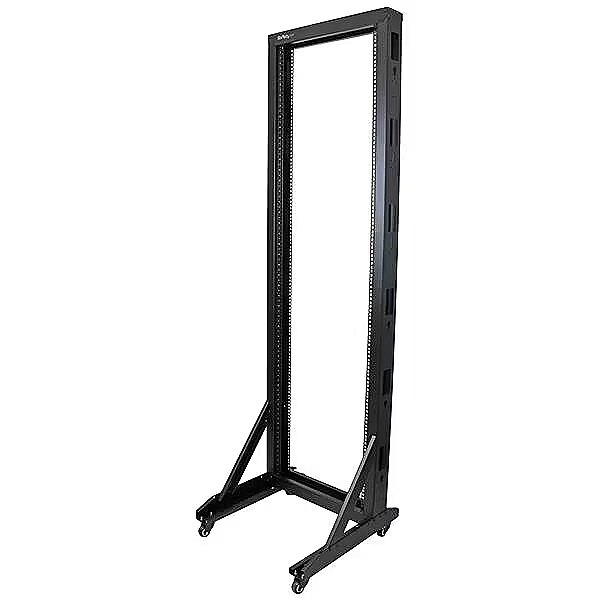 ShortSummaryDescription - StarTech.com 2-Post 42U Mobile Open Frame Server Rack, Two Post 19in Network Rack with Wheels, Rolling Open Rack for AV/Data/Media/IT Equipment, Computer Rack for Home/Office Spaces - Casters Included, Freestanding rack, 42U, 300 kg, Castor wheels, 22.5 kg, Black