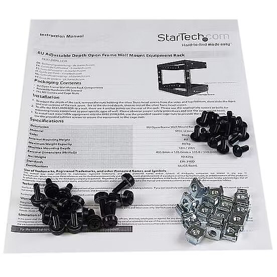 ShortSummaryDescription - StarTech.com 8U 19" Wall Mount Network Rack - 12" Deep 2 Post Open Frame Server Room Rack for Data/AV/IT/Computer Equipment/Patch Panel with Cage Nuts & Screws 135lb Capacity, Black (RK812WALLO), Wall mounted rack, 8U, 80 kg, 7.2 kg, Black