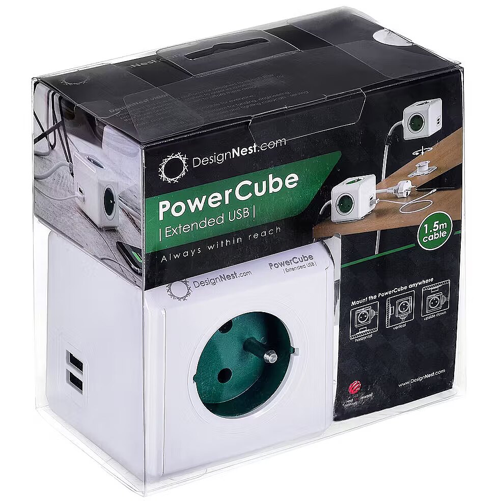 This avoids the cumbersome bending of the sockets, which are often found in inaccessible places. PowerCube Extended lets you combine several cubes.   Mount. Twist. Charge. Tape your dock to any smooth surface. Twist and lock your PowerCube to the dock. Turn your mounted PowerCube a full 360 degrees to plug in at any corner. Perfectly suited for reachable access to charging all your devices. Power Within Reach Struggling to charge your phone because the power outlet is across the room? Or maybe your wall outlet is hidden behind your desk or bed? Whether you need outlets near your bedside or desk, the PowerCube |Extended| is a perfect choice. This durable cable provides power across the room. You need power? We got you! No Plug Blockage Are those bulky laptop plugs getting in the way of the other power outlets? The PowerCube |Extended| is perfectly suited to neatly plug in all your devices. Dual-USB Charging The PowerCube |Extended USB| comes with dual powered USB-A ports (2.1A) that are compatible with your smartphones and tablets. No additional adapter needed. Stack to personalize it Stack your PowerCubes to create your desired amount of sockets. Just stack, plug, and power! Have fun creating your own tailored source of power. Childproof Sockets Spring-loaded receptacle cover plates prevent the insertion of objects when unequal pressure is applied. Align the prongs to plug into the sockets. Keep your child safe with our childproof sockets.