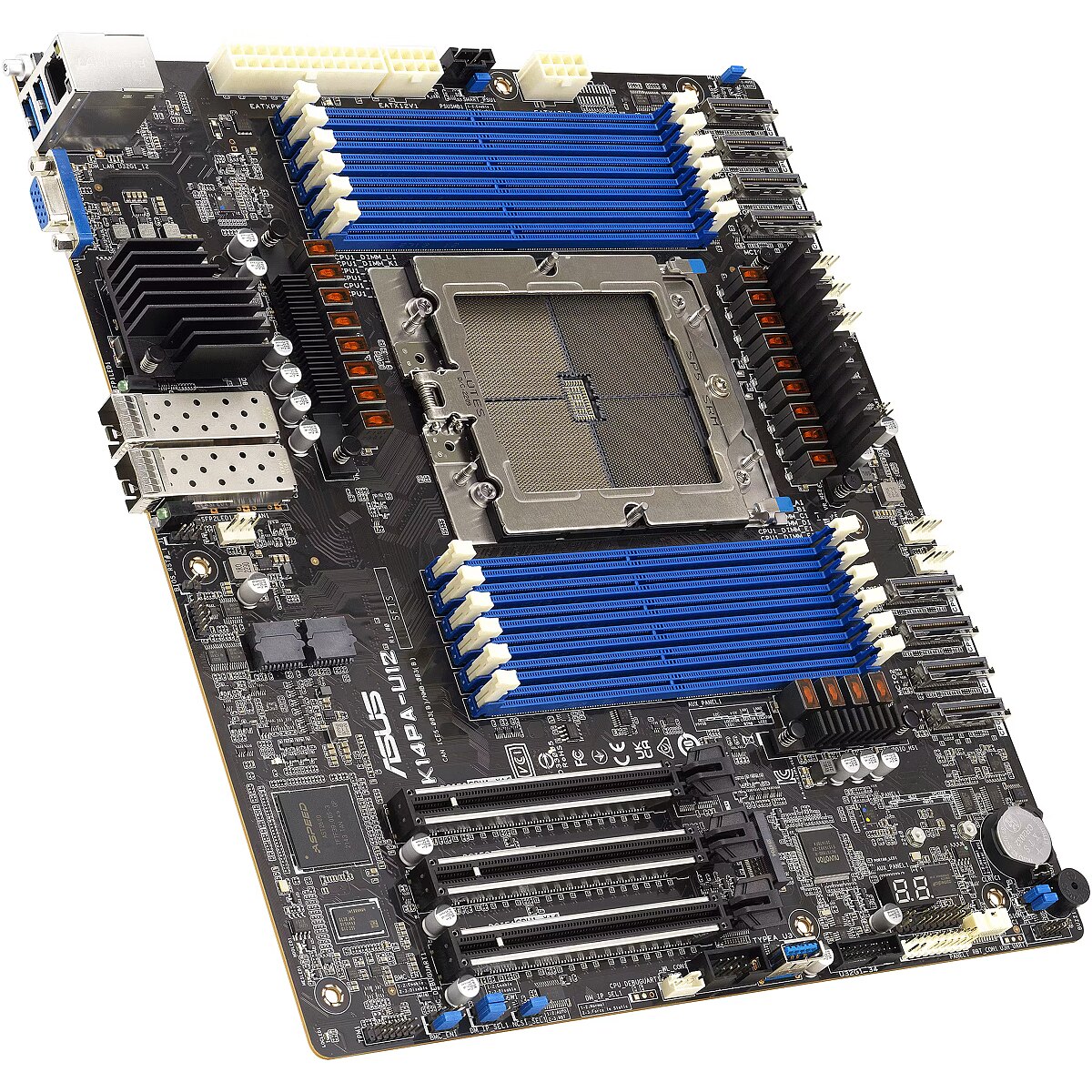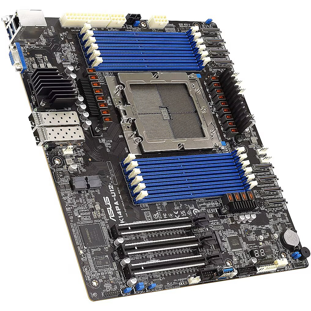 LongDesc - Server motherboard for 128 core AMD EPYC™ 9004-series processors, with dual 25 Gbps LAN, support for two dual-slot GPUs, 12 DIMM DDR5, up to 16 NVMe drives and integrated ASMB11-iKVM.Powered by AMD EPYCTM 9004 processorsAMD EPYC™ 9004 Series processors offer up to 96 Zen 4 cores and 128 Zen 4 cores, exceptional memory bandwidth and a hybrid multi-die architecture. Optimized for diverse computing needs, they excel in high-performance, energy-efficient solutions. Experience enhanced performance and multitasking with AMD 3D V-Cache™ Technology, which increases cache capacity, ensuring smoother overall performance and improved productivity. Elevate your computing with AMD EPYC™ 9004 Series processors.Dual SFP28 25-gigabit Ethernet with teaming supportThe K14PA-U12 provides ultra-high-speed network connectivity, with each SFP28 25-gigabit Ethernet connection offering up to 25 Gbps of bandwidth, vastly outperforming traditional gigabit Ethernet. This speed enhances data traffic handling, thereby improving application performance. Additionally, it ensures reliability through teaming support, where multiple network interface cards (NICs) combine for enhanced redundancy, minimizing service interruptions. The server's low-latency SFP28 technology is crucial for real-time applications like high-frequency trading and video conferencing.Flexible expandabilityThe K14PA-U12 also boasts eight MCIO slots, with MCIO7/MCIO8 supporting both NVMe and SATA devices. This design offers versatile storage options, allowing users to choose between NVMe and SATA drives to meet a variety of storage needs. Additionally, it ensures high performance with support for NVMe drives, making it ideal for data-intensive applications like databases and content creation.K14PA-U12’s scalability is another standout feature, as it can accommodate up to 16 NVMe drives — providing ample storage capacity that can readily expand to meet the growing demands of data-intensive operations. Up to two dual-slot GPUs are also supported.Comprehensive IT infrastructure managementK14PA-U12 features an embedded iKVM module and is optionally equipped with ASUS Control Center, offering comprehensive out-of-band and in-band management features tailored for small and mid-size businesses. The embedded ASUS ASMB11-iKVM module supports remote BIOS updates, fan control, standalone KVMs, video recording and BSOD capture, providing around-the-clock remote monitoring and diagnostics. This functionality remains accessible even if the operating system is down or offline, through a user-friendly web-based graphical interface compatible with all major browsers. ASUS Control Center (ACC) further enhances IT infrastructure management, centralizing and integrating monitoring and control for ASUS commercial products, including servers, workstations and digital signage. ACC enables remote BIOS updates, mobile device system monitoring and simplified server management through one-click software updates and dispatching.ASUS ProCool connectorASUS ProCool power connectors are designed without any hollow areas, enabling lower impedance, faster heat dissipation and cooler operating temperatures for reduced power loss and increased cost savings.
