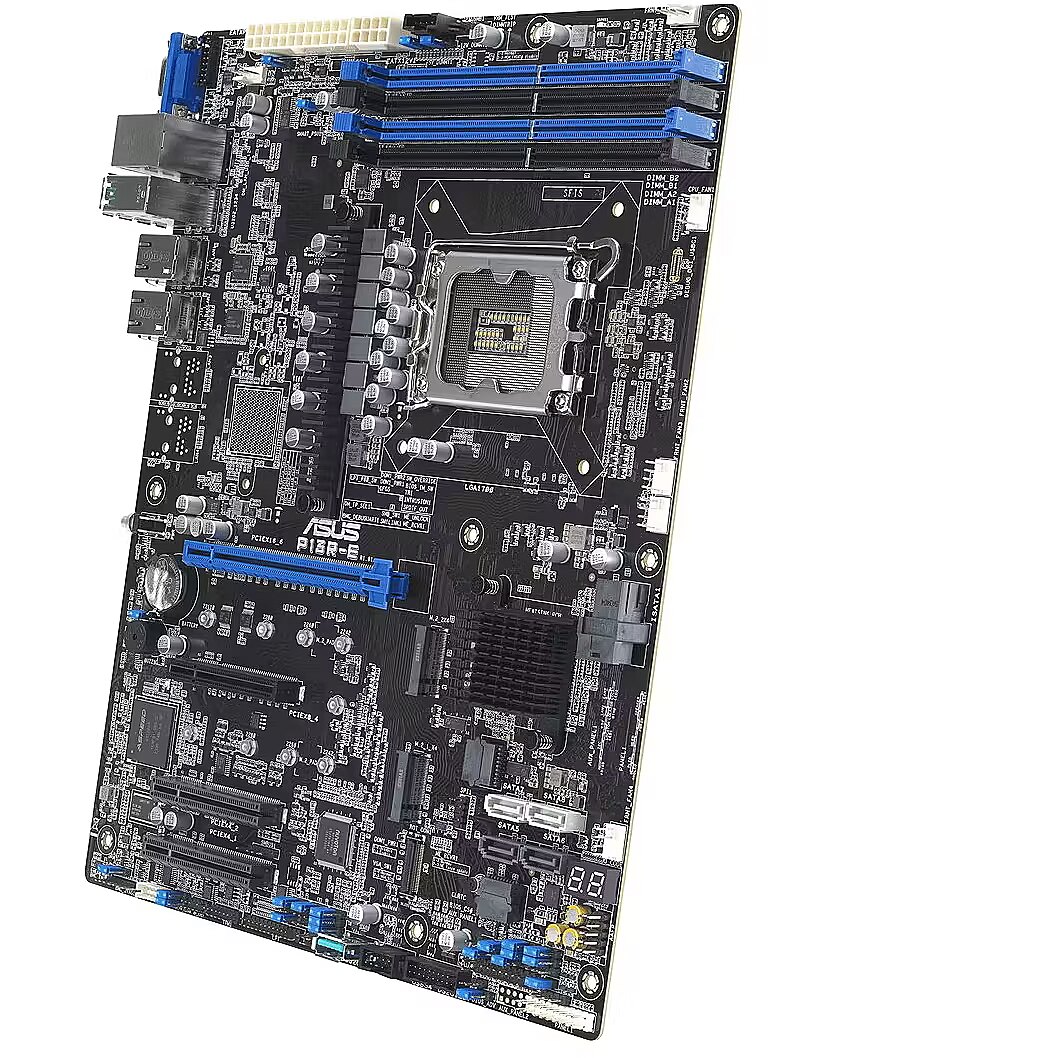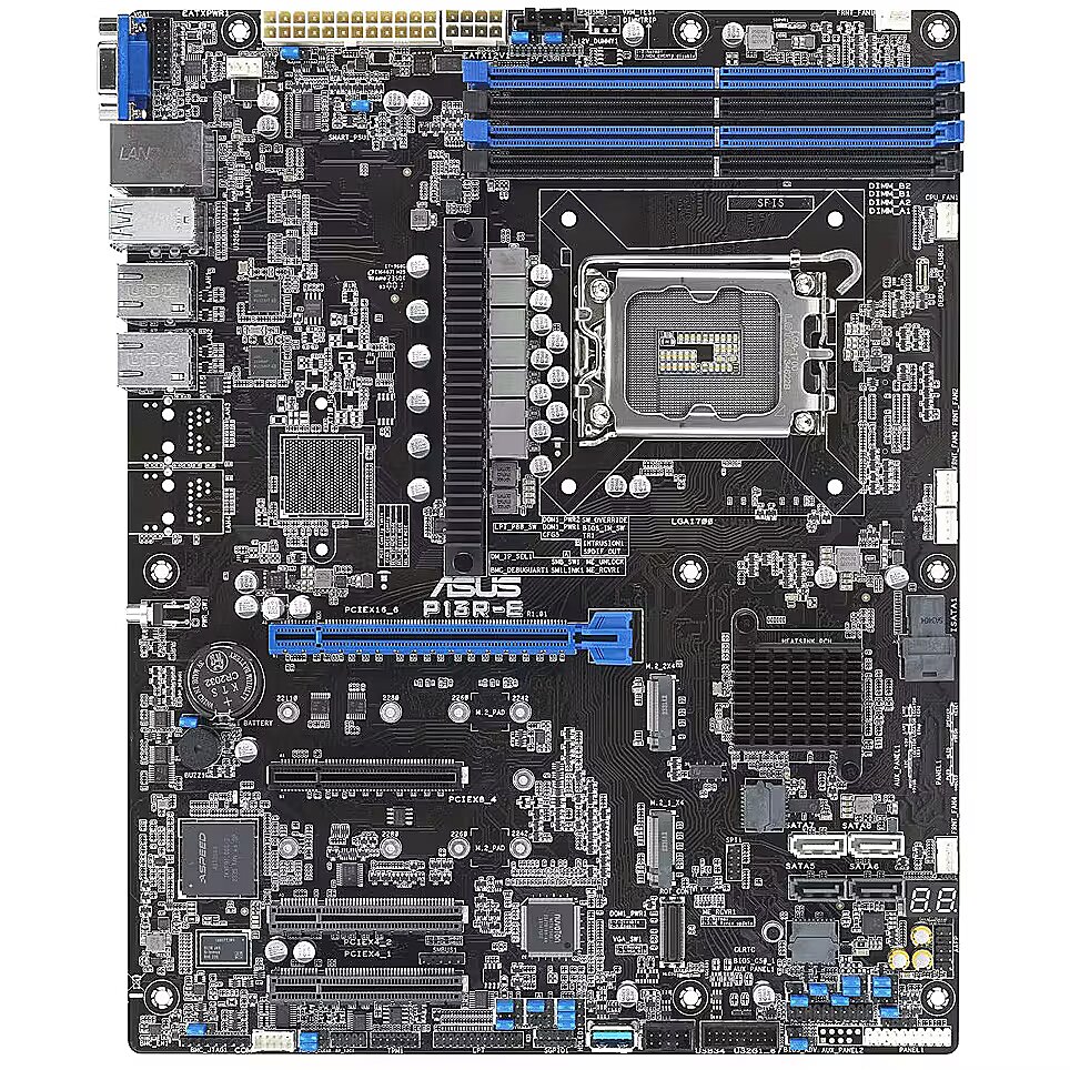 LongDesc - ASUS P13R-E is an Intel® Xeon® E-2400 and Intel® Xeon® 6300 LGA 1700 ATX server motherboard with four DDR5 ECC UDIMM slots, two M.2 slots, dual LAN ports, eight SATA ports, two PCIe® 5.0 slots, two PCIe 4.0 slots, four USB 10Gbps ports, two USB 2.0 ports and an onboard ASUS ASMB11-iKVM management module.PCIe 5.0 ReadyFaster storage, graphics and networking capabilities PCI Express® (PCIe®) 5.0 delivers 32GT/s bandwidth. The ASUS P13R-E supports both PCIe® 4.0 and 5.0 for better LAN scalability and backwards compatibility to satisfy the increasing workloads for modern data center.Intel Xeon E-2400 processors/Intel Xeon 6300 processorsDesigned for small- to medium-sized businesses (SMBs) and cloud-service providers, offering robust and secure solutions. These processors support up to eight cores and 16 threads, with a maximum frequency of 5.6 GHz and a 95 W TDP, ensuring rapid data processing and application responsiveness. They support up to 128 GB of DDR5 4400 MT/s memory (Intel Xeon E-2400) or up to 4800 MT/s memory (Intel Xeon 6300) and PCIe 5.0 interfaces, providing server-grade 24/7 reliability for business-critical services and customer data, and cost-effective performance for entry-level bare-metal cloud services.Two fast USB 3.2 Gen 2 portsASUS P13R-E is equipped with two USB 3.2 Gen 2 ports on its rear I/O panel. These high-speed connections offer rapid data-transfer speeds of up to 10 Gbps, for fast, efficient and reliable file transfers. These sockets are also backward compatible, ensuring seamless connectivity with a wide range of USB devices.Dual Ethernet bandwidthWith dual onboard LAN powered by an Intel I210-AT2 Ethernet controller, P13R-E server motherboards provide business-grade connectivity and support high-density, high-bandwidth, low-latency access-layer networks to ensure faster transfers of large-size files used in data-intensive applications.Versatile Memory and SSD IntegrationThe P13R-E boasts eight SATA ports and four DDR5 ECC UDIMM Memory slots, delivering up to 128 Gbps performance and incorporates two M.2 22110 slots for faster OS booting. This integration services as accelerators for virtualized workloads, boosting the server productivity.Comprehensive IT infrastructure managementP13R-E features an embedded iKVM module and is optionally equipped with ASUS Control Center, offering comprehensive out-of-band and in-band management features tailored for small and mid-size businesses. The embedded ASUS ASMB11-iKVM module supports remote BIOS updates, fan control, standalone KVMs, video recording and BSOD capture, providing around-the-clock remote monitoring and diagnostics. This functionality remains accessible even if the operating system is down or offline, through a user-friendly web-based graphical interface compatible with all major browsers. ASUS Control Center (ACC) further enhances IT infrastructure management, centralizing and integrating monitoring and control for ASUS commercial products, including servers, workstations, and digital signage. ACC enables remote BIOS updates, mobile device system monitoring, and simplified server management through one-click software updates and dispatching.