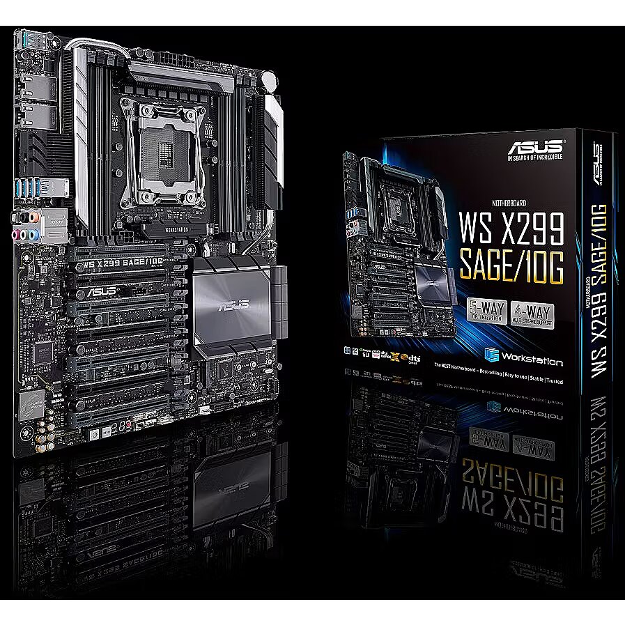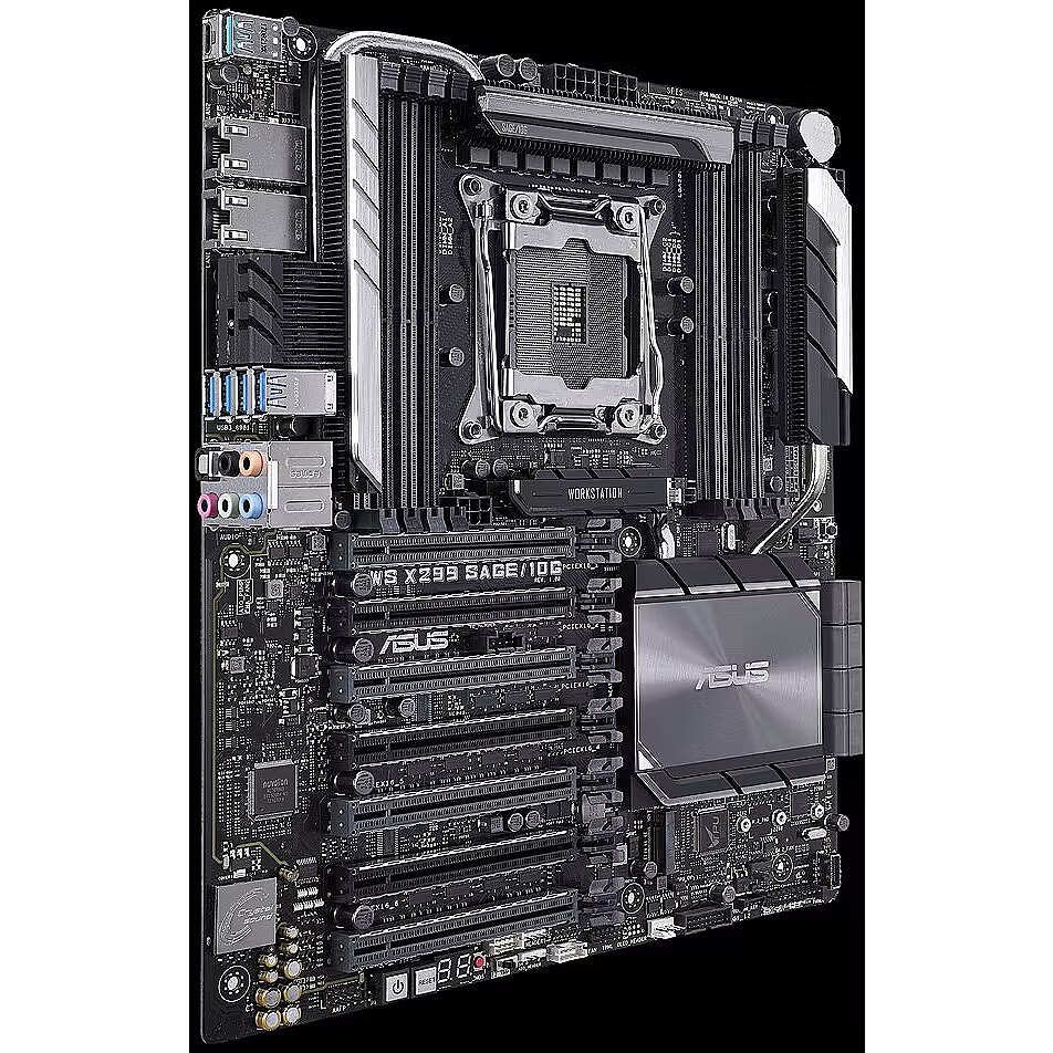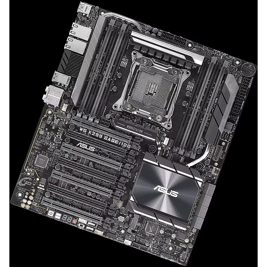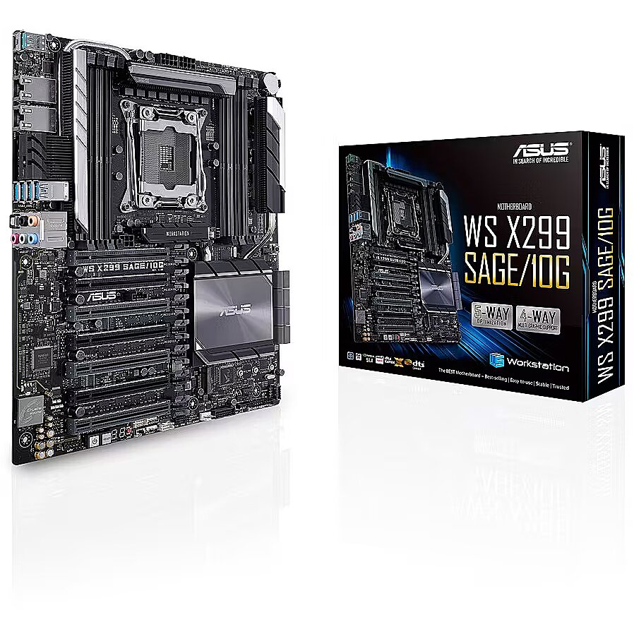 LongDesc - The new WS X299 Sage/10G motherboard delivers a blend of tremendous GPU performance with up to Quad-SLI support, server-grade validation and comprehensive cooling options to provide the perfect system build for training neural networks and crunching other scalable compute loads. It shares the same refined aesthetics as WS X299 Sage/10G and adds dual 10 Gigabit Ethernet ports with the Intel X550AT2 10GBASE-T controller for uncompromising networking performance. Dual PLX chips extend the number of PCIe lanes to provide additional expansion slots, giving you robust connectivity options to configure your system with the tools you need to get your job done.Workstation exclusiveDual onboard 10G LANFeaturing dual onboard 10G LAN ports backed by the cutting-edge Intel X550AT2 10GBASE-T Ethernet controller, WS X299 Sage/10G provides server-class connectivity that supports high-density, high-bandwidth and low-latency access-layer networks. With data-rates up to 10Gbps, WS X299 Sage/10G is able to transfer 4K videos and other large files in a fraction of the time required by conventional networking gear. The onboard controller negates the need to allocate a PCI Express slot to a dedicated network card, saving valuable space for other components.Multi-GPU supportWS X299 Sage/10G fits up to four dual-slot graphics cards and supports both NVIDIA® SLI™ and AMD CrossFireX™ 4-way configurations to enable multi-GPU setups that harness the full power of the latest graphics technologies, including NVIDIA® Quadro®. With performance beyond 15.23 TFLOPS*, NVIDIA Quadro is the perfect complement to WS X299 Sage/10G, delivering the best performance for design, modeling, medical research, and processing-intensive simulation and rendering applications.Media-acclaimed UEFI BIOSThe smoothest, slickest mouse-controllable graphical BIOS has been improved to make it even more appealing. Whether you're a PC novice or a seasoned overclocker, EZ and Advanced modes will help you find your way with ease.EZ Tuning WizardQuickly apply a CPU overclock to improve system performance, or configure a RAID array for faster data retrieval and backups.My FavoritesQuickly discover tuning options and add preferred tools to the list.Make your memory go fasterWith optimized trace paths for time-aligned signaling and minimal crosstalk, third-generation ASUS T-Topology offers enhanced memory stability and compatibility, allowing support for memory speeds of DDR4-4200MHz and beyond.OC Design – ASUS PRO Clock II TechnologyWS X299 Sage/10G includes a dedicated base-clock (BCLK) generator that extends CPU and memory overclocking margins. This custom solution works in tandem with the TPU to enhance voltage and BCLK overclocking control, providing the flexibility to extract every ounce of performance from Intel® Core™ X-series processors.Cooler by DesignFlexible Cooling ControlsWS X299 Sage/10G features the most comprehensive cooling controls ever, configurable via Fan Xpert 4 or the UEFI BIOS.Advanced thermal design for maximized performanceDesigned for the all-around workstation, WS X299 Sage/10G features a robust thermal solution that dissipates heat from the VRM, Ethernet controller and PLX chips to prevent throttling. An additional heatsink array covers these components and heatpipes lie within the path of maximum chassis airflow to provide optimal cooling for your workstation, ensuring maximum performance and system stability.ProCool power connectorASUS ProCool is the power connector reinvented. Compared with traditional power connectors, ProCool connectors provide a more secure, low resistance connection, enabling better heat dissipation and improved reliability.Ultrafast connectivityDual Onboard M.2Unleashed storage speeds of up to 32GbpsWS X299 Sage/10G features dual onboard M.2 slots, each operating at X4 PCI Express 3.0 to provide an abundant 32Gbps of bandwidth.VROCUpgrade your RAIDIntel Virtual RAID on CPU (VROC) obliterates PCH-based RAID arrays that are bottlenecked by the 32Gbps limit of the DMI bus, allowing you to utilize CPU PCIe lanes to configure a bootable RAID array that can transfer data at insane speeds.*A VROC key is required to enable VROC RAID arrays. For information about VROC key availability, please contact your local Intel representative.U.2 connectorsJoin the NVMe revolutionThe revolutionary specification that lets your SSDs scream at top speed. Simply attach your choice of drive and experience data-transfer speeds of up to 32Gbps — and free up a PCIe slot for another expansion card.Intel Optane memoryIntel Optane memory readyIntel® Optane™ is a revolutionary non-volatile memory technology supported by WS X299 Sage/10G. Intel Optane memory modules accelerate attached storage to reduce boot and load times, so everything feels faster and more responsive.USB 3.1 Gen 2 front-panel connectorFuture-proof connectivityWS X299 Sage/10G's front panel USB 3.1 connector is ready for next-gen PC cases and devices.USB 3.1 Gen 2 Type-A & Type-CUltimate-speed 10Gbps with USB 3.1 Gen 2 onboardWith backward-compatible USB 3.1 Gen 2 Type-A™ and reversible USB 3.1 Gen 2 Type-C™ ports, you'll experience ultimate connection flexibility and blazing data-transfer speeds of up to 10Gbps.Reliable stability and validationServer-grade memory validationWS X299 Sage/10G supports up to 128GB of quad-channel DDR4 RAM to readily handle the larger data sets found in professional workloads. Strict validation with a wide variety of memory types and operating conditions — including factors such as time, temperature and voltage ranges — ensures that WS X299 Sage/10G provides the reliability and stability professionals depend upon to get their work done.SafeSlotProtect your Graphics Card InvestmentSafeSlot is the PCIe slot reinvented by ASUS and engineered to provide protect your graphics card investment. Manufactured in a single step using a new insert-molding process, SafeSlot integrates the slot with fortifying m