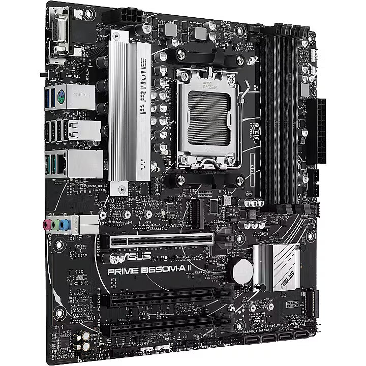 LongSummaryDescription - ASUS PRIME B650M-A II-CSM. Processor manufacturer: AMD, Processor socket: Socket AM5, Compatible processor series: AMD Ryzen 7000 Series. Supported memory types: DDR5-SDRAM, Maximum internal memory: 128 GB, Memory slots type: DIMM. Supported storage drive interfaces: M.2, SATA III, Supported storage drive types: HDD & SSD. Ethernet interface type: 2.5 Gigabit Ethernet. Component for: PC, Motherboard form factor: micro ATX, Motherboard chipset family: AMD